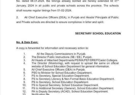 یکم فروری 2024ء سے اسکول ریگولر ٹائمننگ پر کھلیں گے، نوٹیفیکیشن
