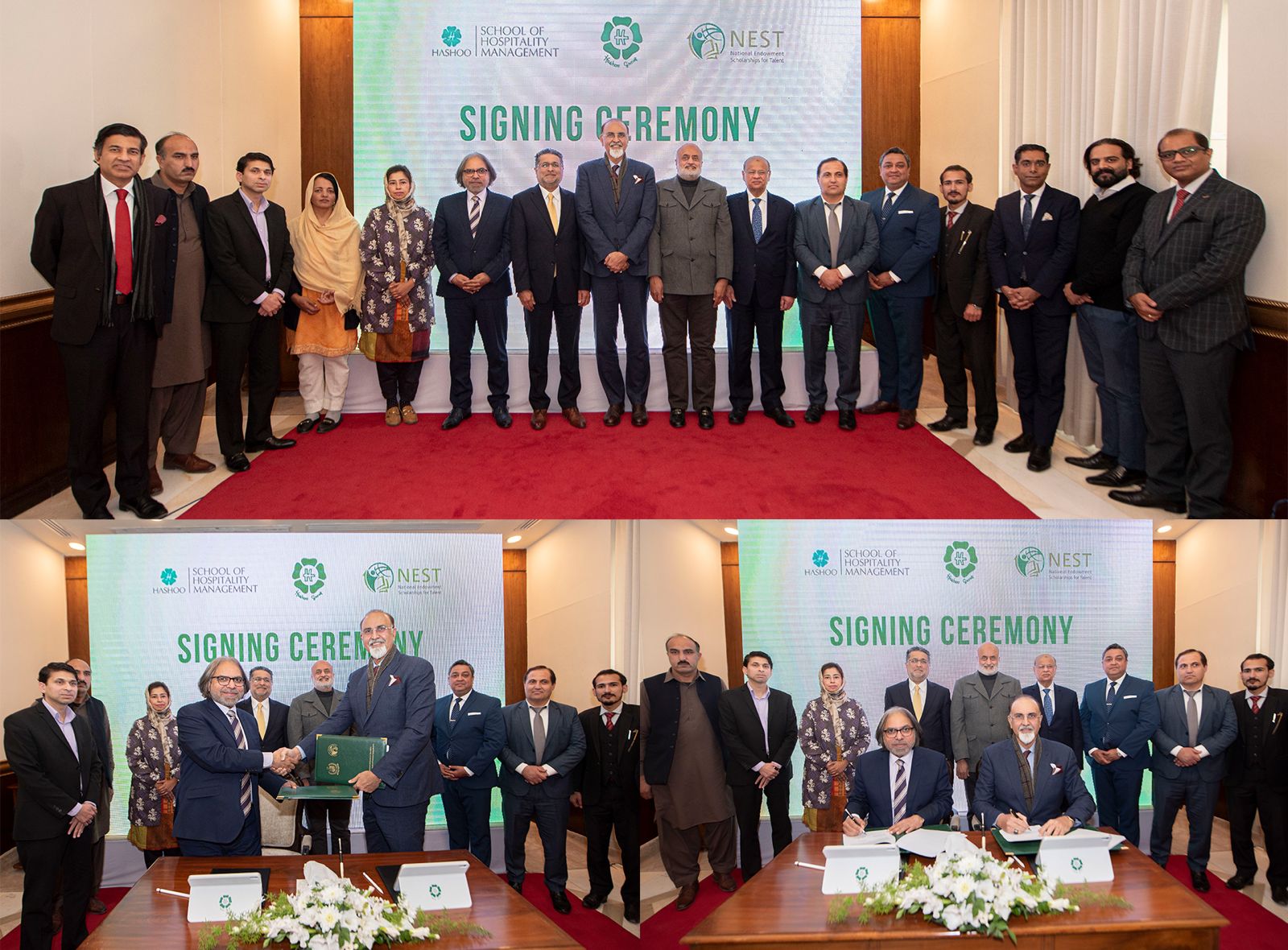 اسلام آباد ،یکم فروری 2024 (عدنان حمید): پاکستان میں پہلی بار سیاحت اور ہوٹلنگ کے شعبوں میں تعلیمی وظائف دینے کے حوالے سے اسلام آباد کے نجی ہوٹل میں تقریب منعقد ہوئی جس میں وفاقی سیکرٹری تعلیم ،وسیم اجمل چوہدری اور ہاشو گروپ کے حسیب اے گردیزی نے مفاہمتی یادداشتوں پر دستخط کیے ۔ اس موقع پر جی ایم نسٹ سیدہ ہاجرہ سہیل ، ٖڈائریکٹر ایجوکیشن ہاشو اسکول آف ہسپٹیلٹی فیصل نعیم خان اور دیگر بھی موجود تھے ۔