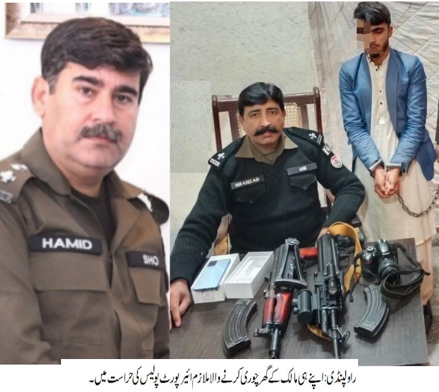 راولپنڈی( )ایس ایچ او تھانہ ائیرپورٹ حامد کاظمی کی زیرنگرانی پولیس ٹیم کی کاروائی،ساتھیوں کے ساتھ ملکراپنے ہی مالک کے گھر چوری کرنے والا ملازم گرفتار، چوری شدہ 02کلاشنکوف، کیمرہ اور موبائل فون برآمد،ملزم شہری کے گھر ملازم تھا جس نے فیملی کی غیر موجودگی میں گھر سے چوری کی تھی۔تفصیلات کے مطابق ائیرپورٹ پولیس نے کاروائی کرتے ہوئے ساتھیوں کے ساتھ مل کر اپنے ہی مالک کے گھر چوری کرنے والے ملزم اکرم کو گرفتار کر لیا،ملزم سے چوری شدہ 02کلاشنکوف، کیمرہ اور موبائل فون برآمدہوئے،ملزم شہری کے گھر ملازم تھا جس نے فیملی کی غیر موجودگی میں گھر سے چوری کی تھی،ملزم کے 02 ساتھی عمران اور رضوان قبل ازیں گرفتار ہوکر چالان ہوچکے ہیں،ایس پی پوٹھوہار ناصر نواز کا کہنا تھا کہ گرفتار ملزم کو ٹھوس شواہد کے ساتھ چالان کیا جائے گا،شہریوں کو ان کے قیمتی اثاثے سے محروم کرنے والے ملزمان قانون کی گرفت سے نہیں بچ سکتے۔