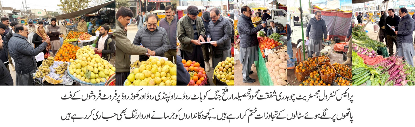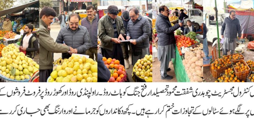 سپیشل پرائس مجسٹریٹ چوہدری شفقت محمود کا گرانفروشوں کے خلاف ایکشن،مہنگے داموں فروٹ فروخت کرنے والے فروٹ فروشوں کو ہزاروں روپے جرمانہ،کسی کو ناجائز منافع خوری کی اجازت نہیں دے سکتے عوام کو ریلیف فراہم کرنا اولین ترجیح ہے تاجر حضرات مقررہ نرخوں سے ہر گز تجاوز نہ کریں بصورت دیگر سخت قانونی کاروائی عمل میں لائی جائے گی جرمانوں کے ساتھ جیل بھی جانا پڑے گا چوہدری شفقت محمود کا انتباہ،تفصیلات کے مطابق سپیشل پرائس مجسٹریٹ چوہدری شفقت محمود نے حکومت پنجاب کے وژن کے مطابق ڈپٹی کمشنر اٹک کی زیر نگرانی فتح جنگ اور حسن ابدال میں عوام کو مناسب نرخوں پر اشیاء کی فراہمی اور سرکاری نرخ ناموں پر عمل درآمد کیلئے اچانک چیکنگ کا سلسلہ جاری ہے گزشتہ روز کھوڑ روڈ پر فروٹ سبزی اور دیگر اشیاء کے نرخ چیک کئے اور مقررہ نرخوں سے زائد وصول کرنے پر فروٹ فروشوں کومجموعی طور پر 1لاکھ 25ہزار روپے جرمانہ عائد کیا ہے چوہدری شفقت محمود نے دکانداروں کو انتباہ کیاہے کہ وہ ہر گز ہرگز سرکاری نرخوں سے وصولی نہ کریں منصوعی مہنگائی پیدا کرنے سرکاری نرخ نامے کی خلاف ورزی اور عوام کو دونوں سے ہاتھوں سے لوٹنے والوں کے خلاف سخت قانونی کاروائی کرینگے انھوں نے کہا کہ عوام کو مناسب اور مقررہ نرخوں پر اشیاء خوردونوش کی فراہمی انتظامیہ کی اولین ذمہ داری ہے کسی کو بھی عوام کے ساتھ نا انصافی کرنے کی اجازت نہیں دی جا سکتی انھوں نے کہا کہ حکومت پنجاب کے وژن کے مطابق ڈپٹی کمشنر اٹک کی زیر نگرانی عوام کو ریلیف پہنچانے کیلئے بھر پور کوشش کر رہے ہیں انھوں نے کہا کہ تاجر حضرات ناجائز منافع خوری سے اجتناب کریں بصورت دیگر ان کو جرمانوں کے ساتھ ساتھ مقدمات کا بھی سامنا کرنا پڑے گا عوامی حلقوں نے چوہدری شفقت محمود کی گرانفروشوں کے خلاف دبنگ کاروائی پر ان کو زبردست الفاظ میں خراج تحسین پیش کی ہے