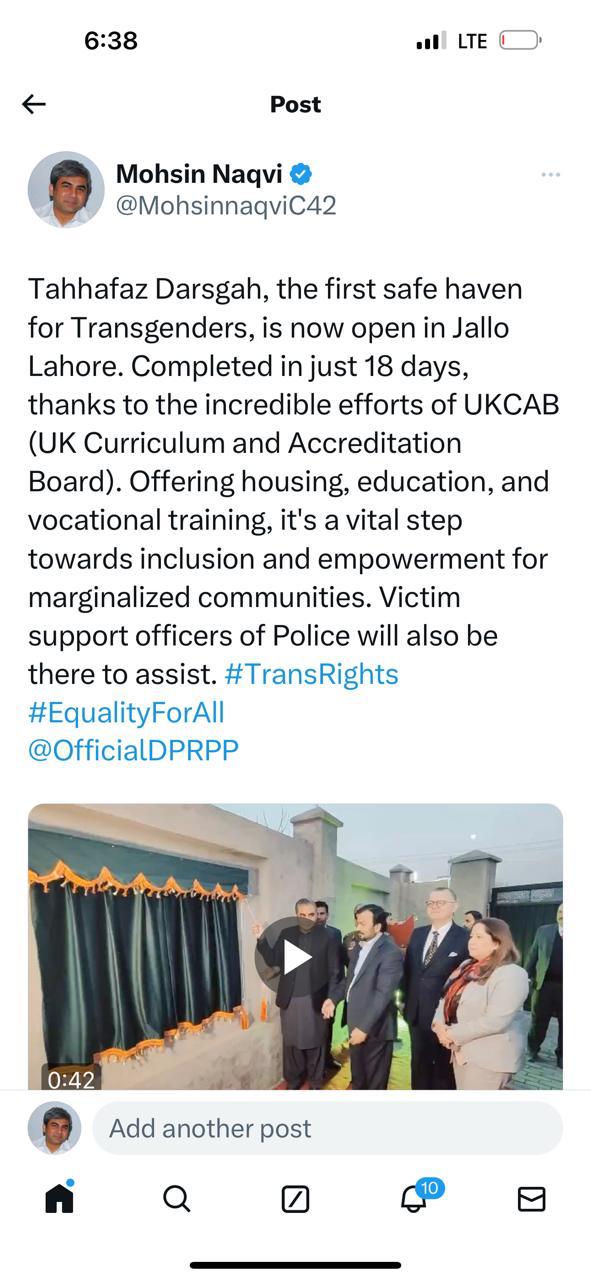 ٹرانس جنیڈر کمیونٹی کے مسائل کے حل کیلئے تحفظ درسگاہ بنانے والی ٹیم نے عملی کام کا مظاہرہ کیا،اللہ تعالی آپ کو اس کی جزا دے گا۔محسن نقوی