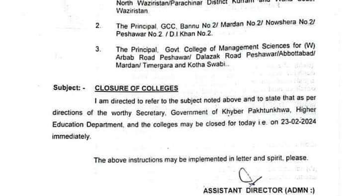 Peshawar: Higher Education Department has closed colleges due to possible protests