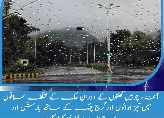 آئندہ چوبیس گھنٹوں کے دوران ملک کے مختلف علاقوں میں تیز ہوائوں اورگرج چمک کے ساتھ بارش اور پہاڑوں پر برفباری کا امکان ہے۔ شمالی بلوچستان میں برفباری سے سڑکیں بند اور گاڑیوں کی آمد ورفت میں خلل جبکہ گوادر، کیچ، پنجگور اور آواران میں موسلادھار بارش کے باعث مقامی ندی نالوں میں طغیانی کا بھی خدشہ ہے۔ مری، گلیات، ناران، کاغان، دیر، سوات، کوہستان، مانسہرہ، ایبٹ آباد، شانگلہ، استور، ہنزہ، سکردو، وادی نیلم، باغ، پونچھ اور حویلی میں برفباری سے گاڑیوں کی آمد ورفت میں خلل کا امکان ہے۔