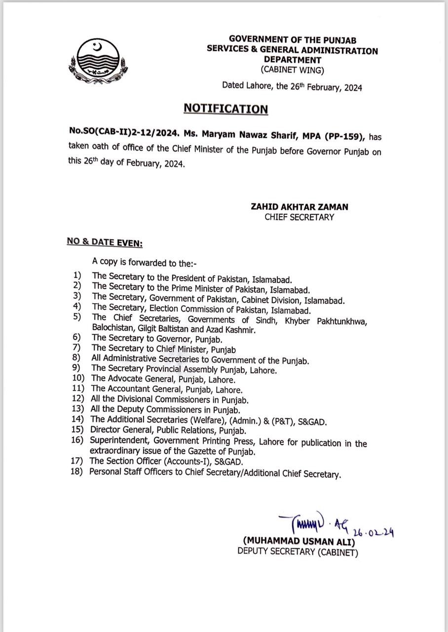 پاکستان تازہ ترین لاہور(سہ پہر)مریم نوازشریف کی تعیناتی کا نوٹیفکیشن جاری admin 2024-02-27 وزیراعلی پنجاب مریم نوازشریف کی تعیناتی کا نوٹیفکیشن جاری
