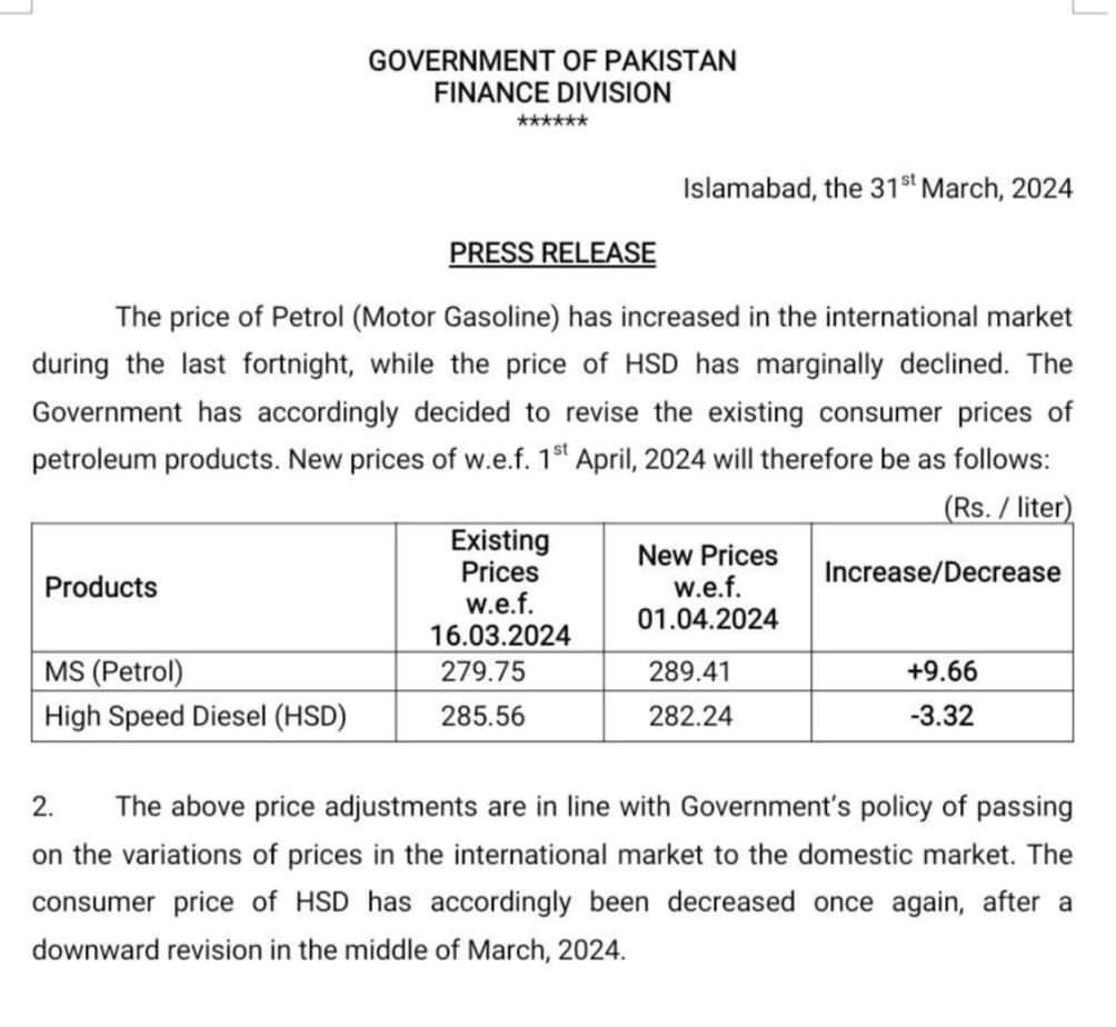 حکومت نے پیٹرول کی قیمت میں اضافہ کر دیا۔دیگر کی قیمتوں میں کمی زرائع