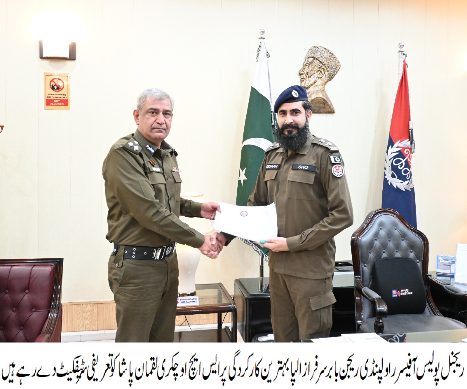 ریجنل پولیس آفیسر راولپنڈی ریجن بابر سرفراز الپا نے ایس ایچ او چکری کو اوورسیز پاکستانی کی درخواست پر فوری کارروائی کرکے دادرسی کرنے پر تعریفی سرٹیفیکیٹ دیا، بہترین کارکردگی کا مظاہرہ کرنے والے پولیس افسران انعام کے حقدار ہیں، آئندہ بھی بہترین کارکردگی کا مظاہرہ کرنے والے افسران کی حوصلہ افزائی کا سلسلہ جاری رہے گا،آر پی اوبابر سرفراز الپا۔تفصیلات کے مطابق ریجنل پولیس آفیسر راولپنڈ ی ریجن بابر سرفراز الپا نے تھانہ چکری میں تعینات ایس ایچ او لقمان پاشا کوبہتر ین کارکردگی پر حوصلہ افزائی کے لیے آر پی او آفس مدعو کیا، ایس ایچ او نے تھانہ چکری میں تعیناتی کے دوران اوورسیز پاکستانی کی درخواست پر فوری کارروائی کرتے ہوئے قبضہ گروپ سے زمین واگزار کروائی جس پر اوورسیز پاکستانی نے بیرون ملک سے تحریری طور پر ایس ایچ او کے لیے تعریفی سرٹیفکیٹ دینے کی درخواست کی جس پر آر پی او راولپنڈی نے ایس ایچ اوچکری کو بہترین کارکردگی کے صلہ میں تعریفی سرٹیفیکیٹ دیا، اس موقع پر آ رپی او راولپنڈی نے گفتگو کرتے ہوئے کہا کہ بہترین کارکردگی کا مظاہرہ کرنے والے پولیس افسران انعام کے حقدا ر ہیں، آئندہ بھی بہترین کارکردگی کا مظاہرہ کرنے والے افسران کی حوصلہ افزائی کا سلسلہ جاری رہے گا۔