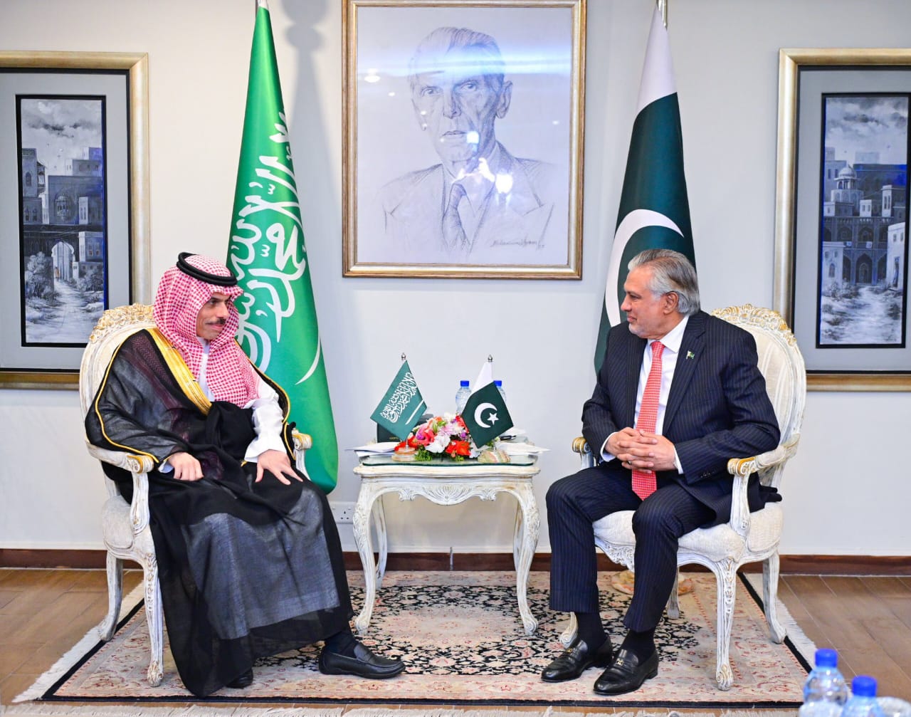 Foreign Minister Mohammad Ishaq Dar received Saudi Foreign Minister Prince Faisal bin Farhan Al Saud at the Ministry of Foreign Affairs today.