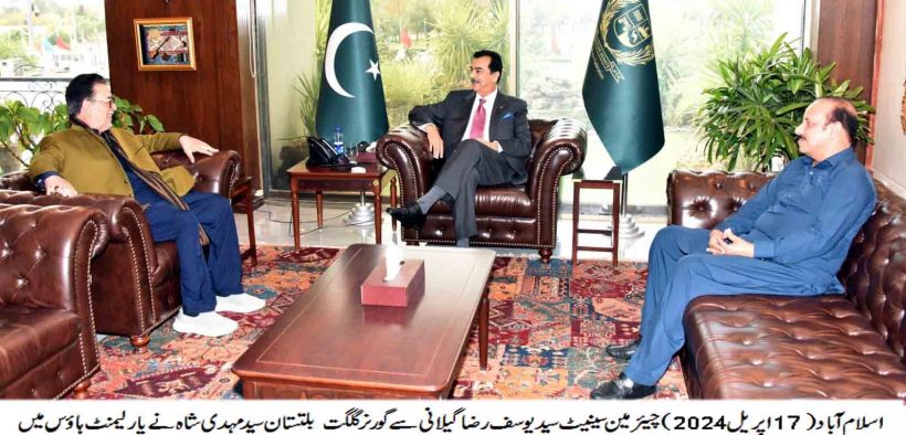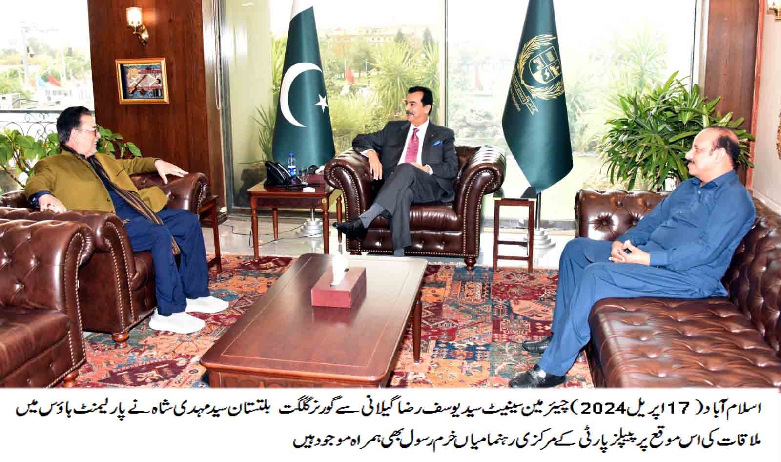 چیئرمین سینیٹ سید یوسف رضا گیلانی سے گورنر گلگت بلتستان سید مہدی شاہ کی پارلیمنٹ ہاؤس میں ملاقات جبکہ ان کے ہمراہ پیپلز پارٹی کے رہنما میاں خرم رسول بھی موجود تھے