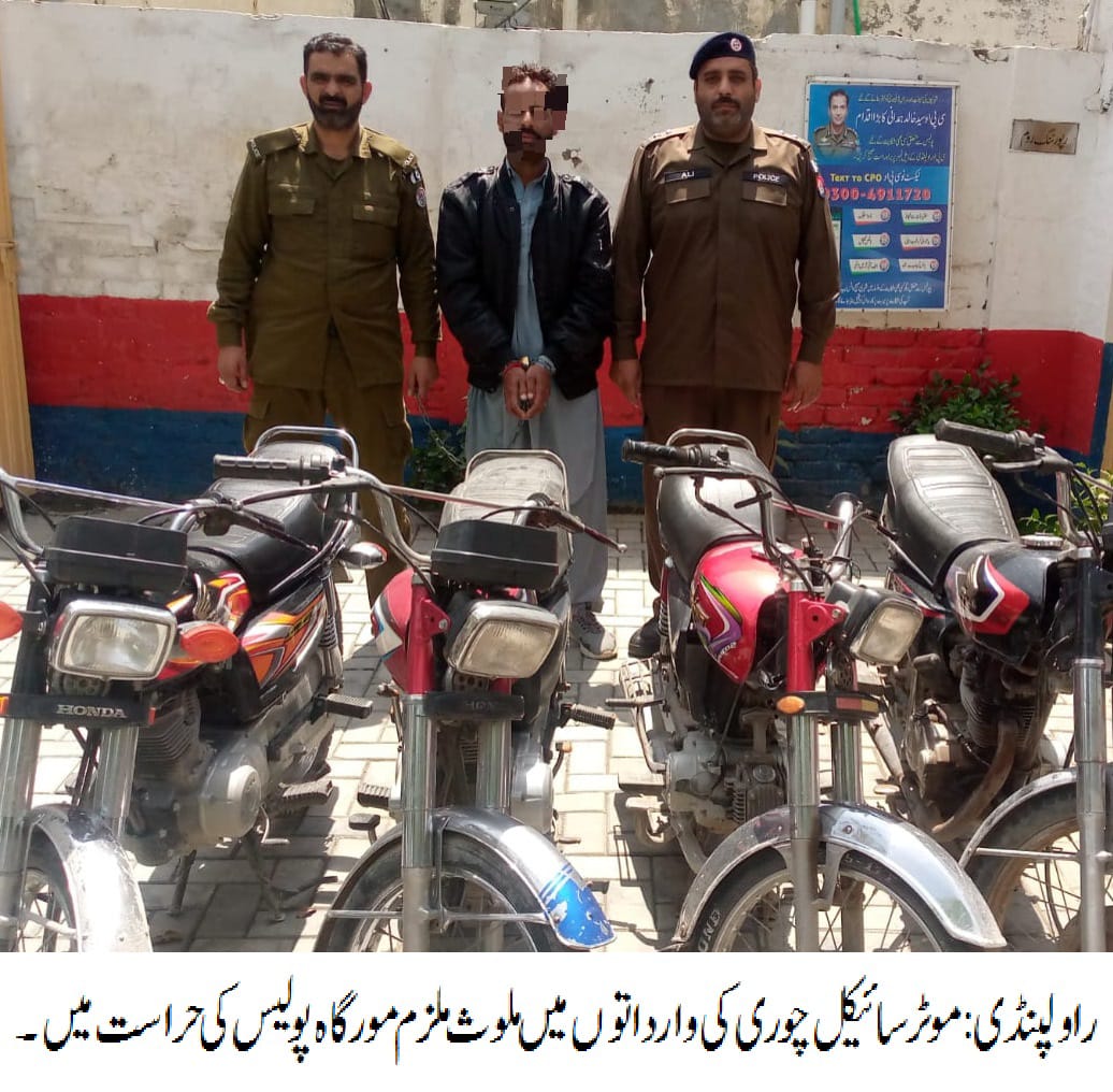 راولپنڈی(سہ پہر)مورگاہ پولیس کی کاروائی،موٹرسائیکل چوری کی وارداتوں میں ملوث ملزم گرفتار