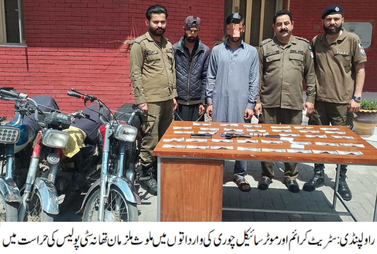 راولپنڈی(سہ پہر) تھانہ سٹی پولیس کی کاروائی،سٹریٹ کرائم اور موٹر سائیکل چوری کی وارداتوں میں ملوث 02 رکنی گینگ گرفتار