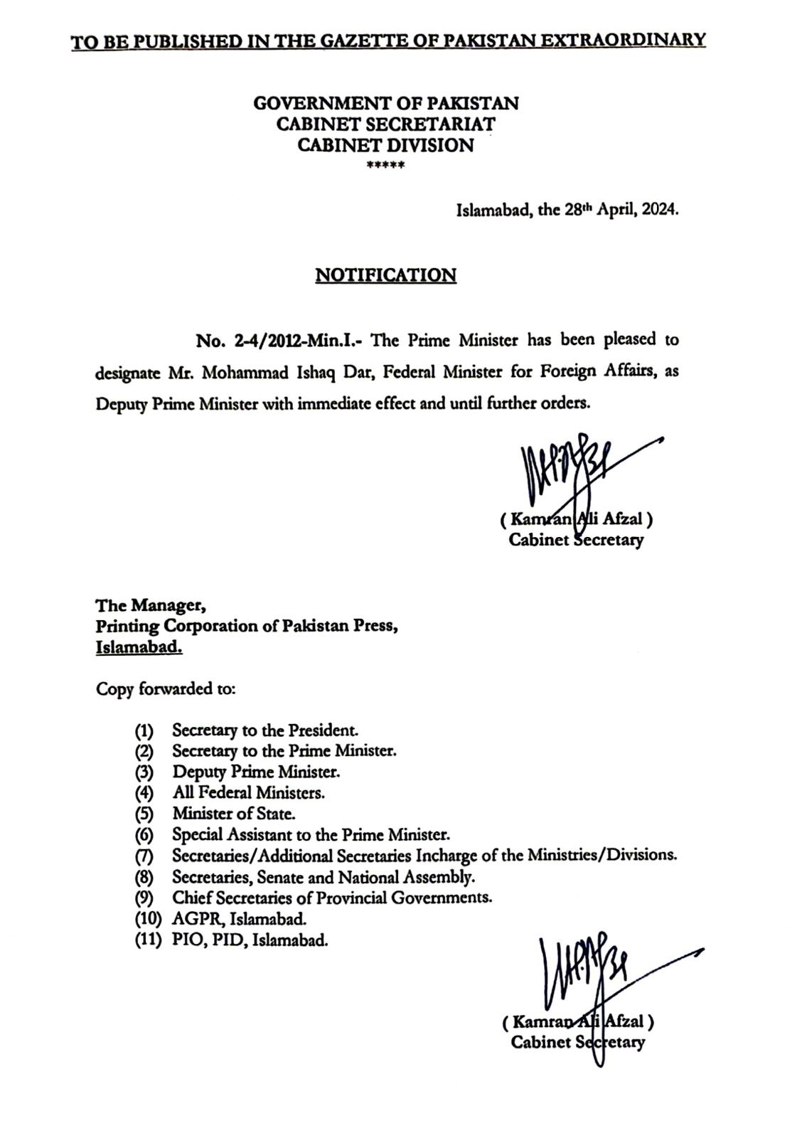 انگلش نیوز Islamabad(Sapeher Times): Foreign Minister M Ishaq Dar has been appointed as Deputy Prime Minister of Pakistan admin 2024-04-29 Important annocuncement: Foreign Minister @MIshaqDar50 has been appointed as Deputy Prime Minister of Pakistan