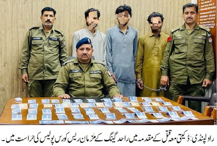 راولپنڈی( )ایس ایچ او تھانہ ریس کورس راجہ افتخار کی زیرنگرانی پولیس ٹیم کی موثر تفتیش، ڈکیتی معہ قتل کے مقدمہ میں راحد گینگ کے ملزمان سے مزید پیش رفت، ملزمان سے شناخت پریڈ کے بعد چھینی گئی رقم 91000روپے برآمد۔تفصیلات کے مطابق ریس کورس پولیس نے تفتیش کرتے ہوئے ڈکیتی معہ قتل کے مقدمہ میں راحد گینگ کے ملزمان سے مزید پیش رفت کرتے ہوئے شناخت پریڈ کے بعد چھینی گئی رقم 91000روپے برآمد کر لی،ملزمان سے قبل ازیں چوری شدہ02 موٹر سائیکل، نقدی 16 ہزار روپے اوراسلحہ برآمد ہوا تھا،گرفتار ملزمان میں عبدالمتین، عبدالوہاب اور احمد شامل ہیں، ملزمان سے اب تک 01لاکھ07ہزارروپے نقدی، 02موٹر سائیکل اور اسلحہ برآمد کیا جاچکا ہے،ملزمان نے سٹور پر ڈکیتی کے دوران فرار ہوتے ہوئے فائرنگ کرکے اپنے ساتھی راحد عرف راحیل کو قتل کر دیا تھا،ملزمان ڈکیتی،سنیچنگ اور موٹر سائیکل چوری کے مقدمات میں ریکارڈ یافتہ ہیں،ایس پی پوٹھوہار کا کہنا تھا کہ گرفتار ملزمان کو ٹھوس شواہد کے ساتھ چالان عدالت کرکے قرار واقعی سزادلوائی جائے گی،شہریوں کی جان و مال پر حملہ کرنے والے قانون کی گرفت سے نہیں بچ سکتے۔
