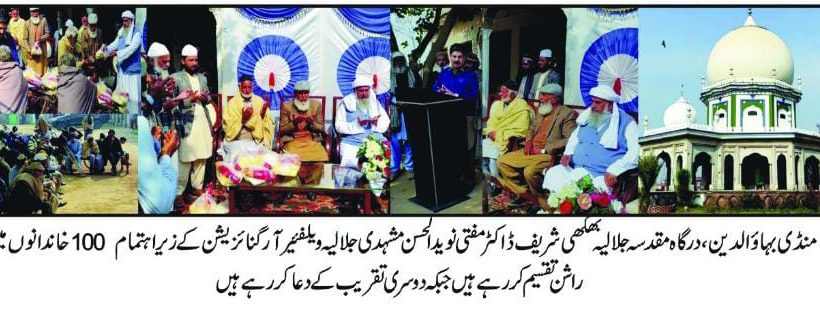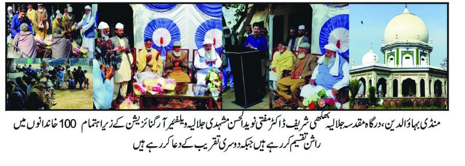 اسلام آباد (سہ پہر) درگاہ مقدسہ جلالیہ بھکھی شریف خدمت خلق کا بہترین پلیٹ فارم ہے۔اسسٹنٹ کمشنر اسفند یار اس تقریب کا مقصد فقراء،غربا اور یتیم بچے اور بیواؤں کو شب برات کی خوشیوں میں شریک کرنا ہے۔ڈاکٹر مفتی نوید الحسن مشہدی جلالیہ ویلفئیر آرگنائزیشن کے زیر اہتمام 100 خاندانوں میں راشن تقسیم کر دیا گیا جلالیہ ویلفئیر آرگنائزیشن کے زیر اہتمام شب برات (عید)کے موقع پر ہر سال کی طرح اس سال بھی 100 خاندانوں میں راشن تقسیم کر دیا گیا۔تقریب کا اہتمام درگاہ مقدسہ جلالیہ بھکھی شریف پر کیا گیا۔تفصیلات کے مطابق ان خیالات کا اظہار درگاہ مقدسہ جلالیہ بھکھی شریف کے سجادہ نشین شیخ الحدیث الحاج ڈاکٹر مفتی پیر سید محمد نوید الحسن شاہ صاحب مشہدی سرپرست اعلی جماعت جلالیہ پاکستان نے کرتے ہوئے فرمایا کہ یہ درگاہ وہ ہے جہاں پر خدمت خلق کو اولین فریضہ سمجھا جاتا ہے ۔یہ خدمت خلق کا سلسلہ مشائخ عظام بھکھی شریف سے چلا آ رہا ہے جس میں دن بدن بہاریں ہی بہاریں ہیں۔کوئی بھی موقع ہو چاہے سیلاب سے متاثرہ علاقے ہوں چاہے زلزلہ سے متاثرہ علاقے ہوں چاہے کرونا جیسی وبا میں افراد گھرے ہوئے ہوں جو بھی موقع ہو یہ درگاہ صف اول میں ہو کر خدمت خلق کا فریضہ سر انجام دیتے ہوئے نظر آتی ہے۔خدمت خلق سے ہی انسان کو قرب الہی میسر ہوتا ہے ۔شب برات کے موقع پر لوگ گھروں میں کھانے میں میٹھا شامل کرتے ہیں اس لئے ان بے سہارا فقرا غربا مساکین یتیم بچے اور بیواؤں میں راشن تقسیم کیا گیا تاکہ یہ لوگ بھی آسانی سے اپنے کھانے میں یہ چیزیں شامل کر سکیں ۔تقریب کے مہمان خصوصی لیفٹیننٹ ریٹائرڈ اسفند یار صاحب اسسٹنٹ کمشنر منڈی بہاؤالدین اور عزت مآب محمد ارشد صاحب اسسٹنٹ ڈائریکٹر سوشل ویلفیئر منڈی بہاؤالدین تھے ۔اسسٹنٹ کمشنر اسفند یار نے کہا کہ یہ درگاہ مقدسہ وہ ہے جہاں سے آج بھی صوفیاء کرام کی تعلیمات سے معاشرہ کو روشناس کروایا جاتا ہے اور یہ درگاہ خدمت خلق کا بہترین پلیٹ فارم ہے۔100 خاندانوں میں راشن تقسیم کرنا یہ ایک مستحسن عمل ہے جس پر درگاہ شریف کے سجادہ نشین ڈاکٹر مفتی پیر سید محمد نوید الحسن شاہ مشہدی کو خراج تحسین پیش کیا جاتا ہے ۔تقریب کے اختتام پر قبلہ مرشد گرامی شیخ الحدیث الحاج مفتی ڈاکٹر پیر سید محمد نوید الحسن شاہ صاحب مشہدی سجادہ نشین آستانہ عالیہ بھکھی شریف نے دعائے خیر فرمائی ۔