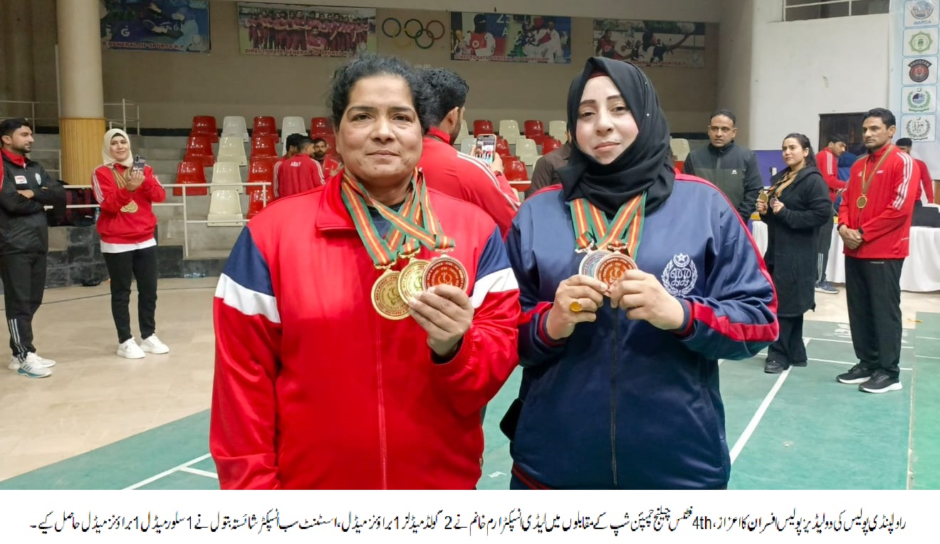 راولپنڈی (سہ پہر)(مظہر شاہ )راولپنڈی پولیس کی دو لیڈیز پولیس افسران کا اعزاز، لیڈی انسپکٹر ارم خانم نے 4واں فٹنس چیلنج چمپئن شپ کے مقابلوں میں 2 گولڈ میڈل اور 1 براؤنز میڈل حاصل کیا،اسسٹنٹ سب انسپکٹر شائستہ بتول نے 1 سلور میڈل اور 1 براؤنز میڈل حاصل کیا۔ تفصیلات کے مطابق راولپنڈی پولیس کی دو لیڈیز پولیس افسران کا اعزاز، لیڈی انسپکٹر ارم خانم نے 4thفٹنس چیلنج چمپئن شپ کے مقابلوں میں 2 گولڈ میڈل اور 1 براؤنز میڈل حاصل کیا،اسسٹنٹ سب انسپکٹر شائستہ بتول نے 1 سلور میڈل اور 1 براؤنز میڈل حاصل کیا، مقابلوں کا انعقاد 2 فروری 2026 کو پشاور میں ہوا،پولیس افسران کو کھیلوں کے مواقع فراہم کر کے انکی صلاحیتوں کو سامنے لانے کے لئے راولپنڈی پولیس تمام وسائل بروئے کار لا رہی ہے۔
