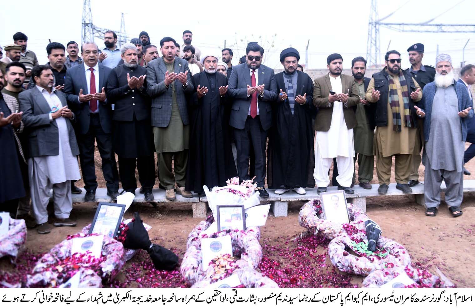اسلام آباد (سہ پہر) گورنر سندھ کامران ٹیسوری کا ترلائی امام بارگاہ کا ایم کیو ایم پاکستان کے ارکان کے ہمراہ دعا اور شہدا ئکی قبروں پر حاضری