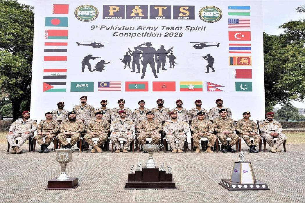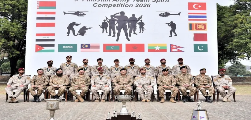 اسلام آباد (سہ پہر) 9واں انٹرنیشنل پاکستان آرمی ٹیم اسپرٹ مقابلہ کھاریاں میں کامیابی سے اختتام پذیر ہوگیا۔ اختتامی تقریب کے مہمانِ خصوصی فیلڈ مارشل چیف آف آرمی اسٹاف اور چیف آف ڈیفنس اسٹاف سید عاصم منیرتھے پاکستان آرمی ٹیم اسپرٹ مقابلہ 60 گھنٹوں پر مشتمل ایک جامع پیٹرولنگ مشق ہے، جس کا مقصد شریک ٹیموں کے درمیان جدید عسکری خیالات، حربی تجربات اور بہترین عملی طریقوں کے تبادلے کے ذریعے پیشہ ورانہ فوجی صلاحیتوں کو فروغ دینا ہے۔ یہ مشق 5 فروری 2026 سے پنجاب کے نیم پہاڑی علاقوں میں منعقد کی گئی، جہاں شرکاء کو ایک حقیقت پسندانہ اور چیلنجنگ آپریشنل ماحول فراہم کیا گیا گزشتہ برسوں میں پاکستان آرمی ٹیم اسپرٹ ایک باوقار اور سخت مقابلے پر مبنی عسکری مشق کے طور پر ابھر چکا ہے، جو شریک ممالک کے درمیان پیشہ ورانہ مہارت، باہمی سیکھنے اور فوجی تعاون کے فروغ میں اہم کردار ادا کر رہا ہے۔ یہ فورم عسکری تعلقات کو مضبوط بنانے کے ساتھ ساتھ مشکل حالات میں باہمی اعتماد، ٹیم اسپرٹ اور بھائی چارے کو فروغ دیتا ہے۔