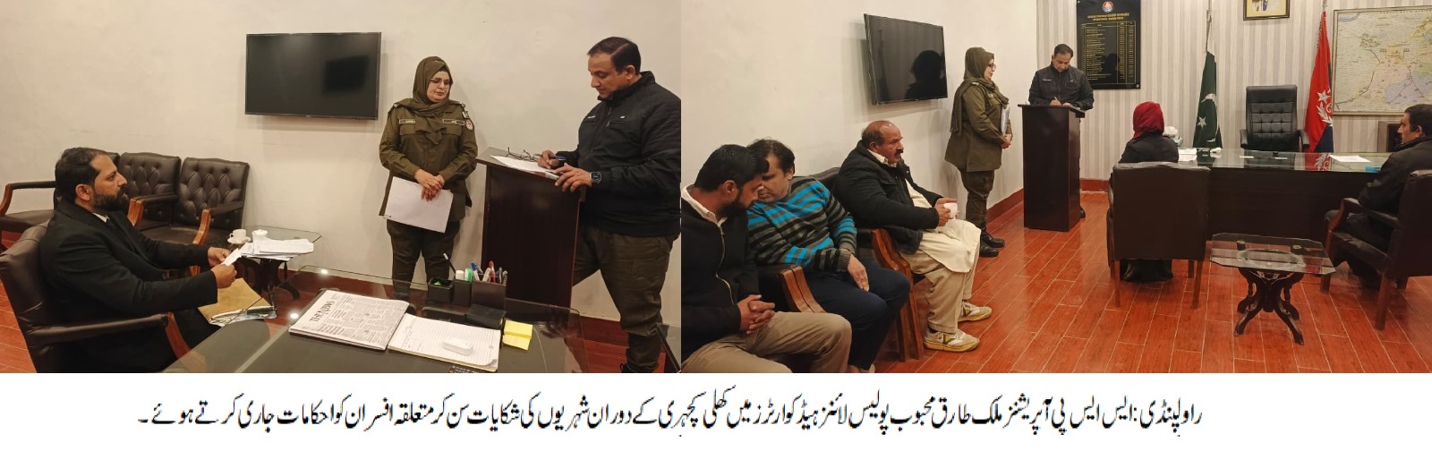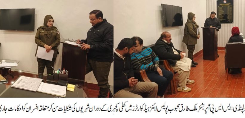 راولپنڈی (سہ پہر) ایس ایس پی آپریشنز ملک طارق محبوب کی پولیس لائنز ہیڈ کوارٹر میں کھلی کچہری ایس ایس پی اپریشنز نے شہریوں کی شکایات سن کر ان کے حل کے لیے متعلقہ افسران کو احکامات جاری کیے مار کردہ درخواستوں پہ دیے گئے ٹائم فریم کے اندر قانونی کاروائی کو یقینی بنایا جائے ایس ایس پی اپریشنز کی متعلقہ افسران کو ہدایت،شہریوں کے مسائل کے فوری حل میں کسی قسم کی غفلت برداشت نہیں کی جائے گی ایس ایس پی آپریشن نے شہریوں کی شکایت سن کر ان کے حل کے لیے متعلقہ افسران کو احکامات جاری کیے تھانوں میں شہریوں کے لیے بہترین سروس ڈلیوری کو ہمہ وقت یقینی بنایا جائے