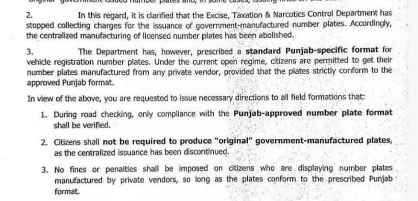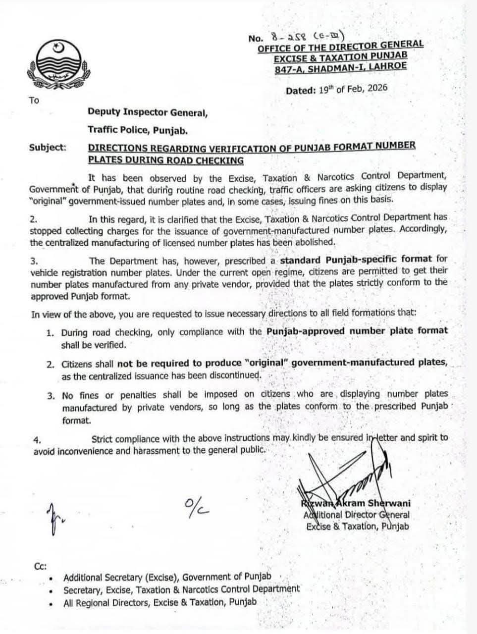 محکمہ ایکسائز پنجاب نے واضح کیا ہے کہ سڑکوں کی چیکنگ کے دوران شہریوں سے “اصل” سرکاری نمبر پلیٹس طلب نہ کی جائیں۔ سرکاری طور پر تیار کردہ نمبر پلیٹس کا نظام ختم کیا جا چکا ہے۔