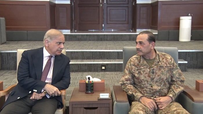 اسلام آباد (سہ پہر) وزیرِ اعظم شہبازشریف کا جی ایچ کیو کا دورہ، افغان طالبان رجیم کے حملوں کو پسپا کرنے پر افواج پاکستان کو زبردست خراج تحسین پیش کیا’ عسکری قیادت نے وزیرِاعظم کو پاکستان افغانستان کی صورتحال پرمفصل بریفنگ دی’ وزیر اعظم نے کہا کہ افغان طالبان رجیم اور فتنہ الخوارج کی پاکستان کے خلاف کاروائیاں ناقابل قبول ہیں فتنہ الخوارج اورافغان طالبان رجیم کےگٹھ جوڑ اور شرپسند کارروائیوں کے لیے زیرو ٹالرنس اپنائی جائے وزیر اعظم نے کہا کہ فیلڈ مارشل سیدعاصم منیر کی قیادت میں افواج پاکستان ملک کی حفاظت کے لیے ہردم تیار ہیں، پاکستان کسی بھی جارحیت کے خلاف اپنا دفاع کرنا بخوبی جانتا ہے’ وزیرِاعظم نے افغان طالبان رجیم کے سرحدی علاقوں میں حملوں کو پسپا کرنے پر افواج پاکستان کی تعریف کیا اور بھرپورجوابی کارروائی کرنے پر افواج پاکستان کی پیشہ ورانہ صلاحیتوں کو سراہا وزیر اعظم نے کہا کہ پوری قوم ارض وطن کی حفاظت کے لیے اپنی افواج پاکستان کے شانہ بشانہ کھڑی ہے