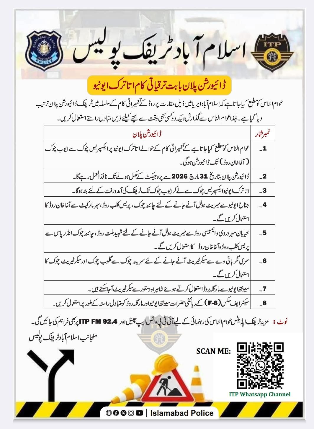 اسلام آباد (سہ پہر) اسلام آباد ٹریفک پولیس نے وفاقی دارلحکومت میں تعمیراتی کام کے حوالے سے ڈائیورشنز پلان جاری کر دیا۔شہریوں کی سہولت کے لئے متبادل راستوں کا انتظام کیا گیا ہے۔تمام افسران شہر میں ٹریفک کی روانی کی برقرار رکھنے کے ساتھ شہریوں کو متاباد ل راستوں کے متعلق آگاہی فراہم کریں۔تفصیلات کے مطابق اسلام آباد ٹریفک پولیس نے وفاقی دارلحکومت میں تعمیراتی کام کے حوالے سے ڈائیورشنز پلان جاری کر دیا۔یہ ڈائیورشن پلان بتاریخ 31 مارچ 2026 سے پروجیکٹ کے مکمل ہونے تک نافذالعمل رہے گا۔شہریوںکی سہولت کے لئے متبادل راستوں کا انتظام کیا گیا ہے۔تعمیراتی کام کے حوالے سے اتاترک ایونیو پر ایکسپریس چوک سے ایوب چوک (آغا خان روڈ) تک ڈائیورشن ہوگی۔اتاترک ایونیو ایکسپریس چوک سے لے کر ایوب چوک تک ٹریفک کی آمدورفت کے لئے بند ہوگا۔اس طرح جناح ایونیوسے میریٹ ہوٹل آنے جانے کے لئے چائنہ چوک ، پریس کلب روڈ، سپر مارکیٹ سے آغا خان روڈ کا استعمال کریں گے جبکہ خیابان سہروردی وایمبیسی روڈ سے میریٹ ہوٹل آنے جانے کے لئے شہید ملت روڈ ، چائنہ چوک انڈر پاس سے پریس کلب روڈ و آغا خان روڈ کا استعمال کریں گے۔مزید سری نگر ہائی وے سے سیکرٹریٹ آنے جانے کے لئے سرینہ چوک سے گلوب چوک اور سیکرٹریٹ چوک کا استعمال کریں گے۔سیونتھ ایونیو سے مارگلہ روڈ استعمال کرتے ہوئے شاہراہ دستور سے سیکرٹیریٹ آ جا سکتے ہیں جبکہ سیکٹر ایف سکس کے رہائشی حضرات سیونتھ ایونیو اور مارگلہ روڈ کو متبادل راستہ کے طور پر استعمال کریں۔چیف ٹریفک آفیسر اسلام آباد محمد سرفراز ورک نے کہا کہ جہاں جہاں روڈ بند کئے جا ئیں گے وہاں متبادل راستہ مہیا کرنے کے لئے ٹریفک پولیس کے افسران شہریوں کی رہنمائی کے لئے موجود ہو ں گے۔انہوں نے شہریوں سے اپیل کی ہے کہ وہ کانفرنس کے دوران متبادل راستوں کا استعمال کریں اور ٹریفک پولیس سے تعاون کریں۔انہوں نے مزید کہا کہ ایف ایم ر یڈیو92.4 اور دیگر سوشل میڈیا ذرائع سے بھی شہریوں کو تمام تر صورت حال سے باخبر رکھے جائے گ