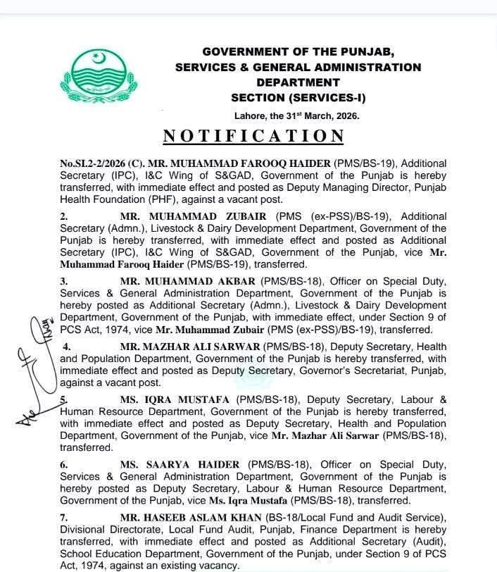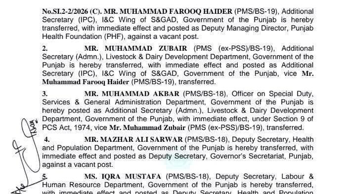 لاہور (سہ پہر) پنجاب حکومت میں بڑے پیمانے پر افسران کے تقرر و تبادلے کر دیے