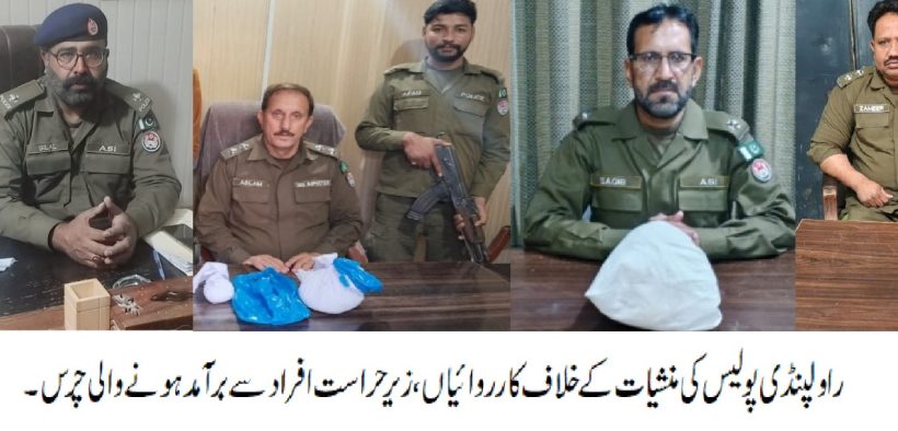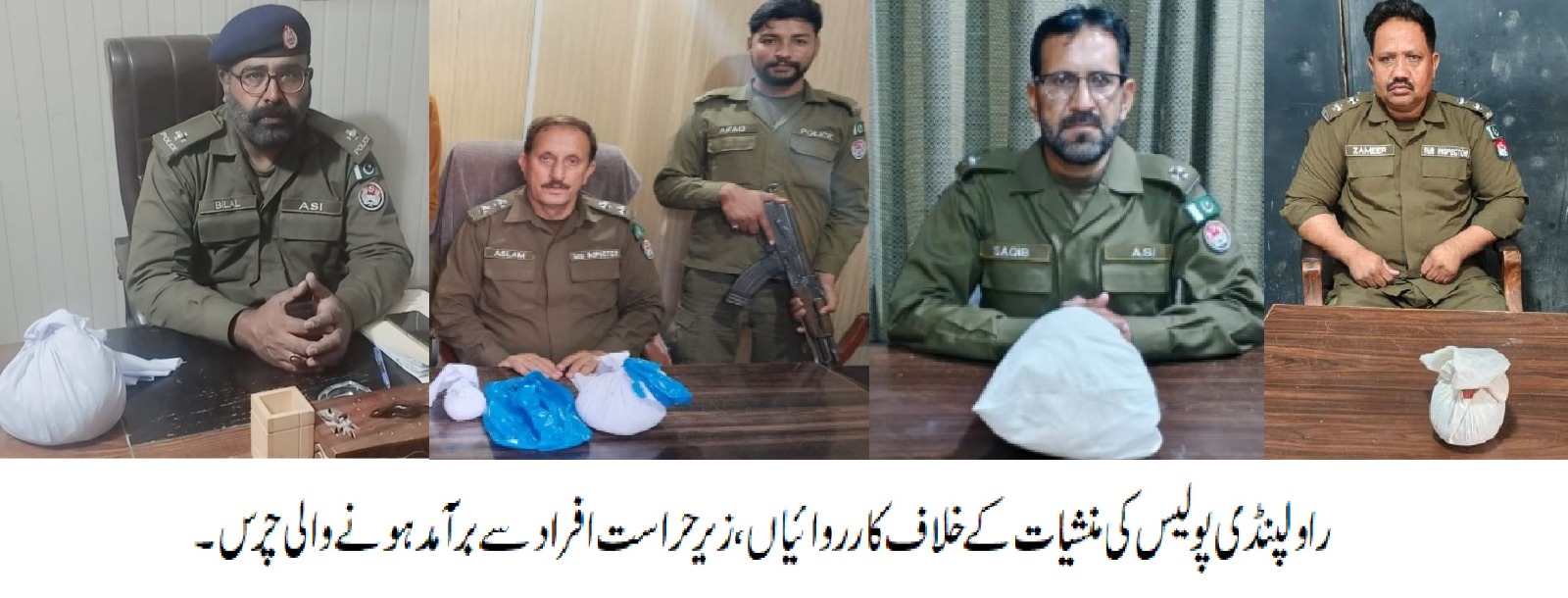 راولپنڈی (سہ پہر) سی پی او سید خالد محمود ہمدانی کی ہدایت پر راولپنڈی پولیس کا منشیات کے خلاف کریک ڈاؤن، 4 منشیات سپلائر گرفتار، ساڑھے 6 کلو سے زائد چرس برآم