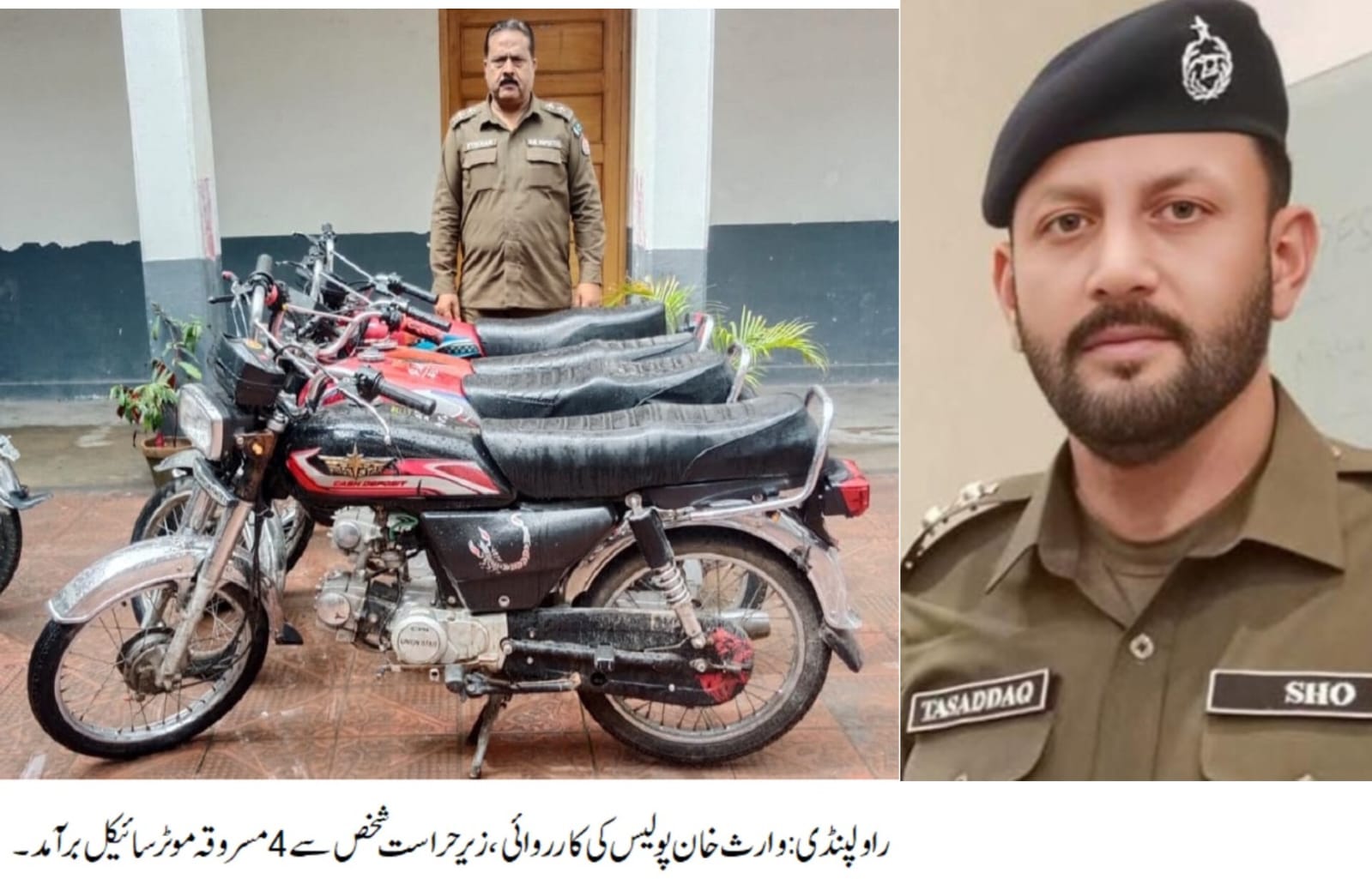 راولپنڈی (سہ پہر) ایس ایچ او تھانہ وارث خان راجہ تصدق کی سربراہی میں پولیس کا جرائم پیشہ افراد کیخلاف کریک ڈاؤن جاری ۔ موٹرسائیکل چوری کی وارداتوں میں ملوث شخص گرفتار 4 مسروقہ موٹرسائیکل برآمد ۔ جرائم پیشہ عناصر کیخلاف بلاتفریق کاروائیاں جاری رہیں گی ( ایس ایچ او وارث خان راجہ تصدق ) تفصیلات کے مطابق ایس ڈی پی او وارث خان سركل رانا نعیم کی زیرنگرانی ایس ایچ او وارث خان کی سربراہی میں پولیس ٹیم نے علاقے میں جرائم پیشہ عناصر کیخلاف کریک ڈاؤن میں موٹر سائیکل چوری کی وارداتوں میں ملوث شخص کو گرفتار کر لیا دوران تفتیش گرفتار شخص سے 4 مسروقہ موٹر سائیکل برآمد ہوئے ، ایس پی راول سعد ارشد نے وارث خان پولیس ٹیم کو شاباش دیتے ہوئے کہا کہ زیرحراست شخص کو ٹھوس شواہد کے ساتھ چالان عدالت کیا جاۓ گا