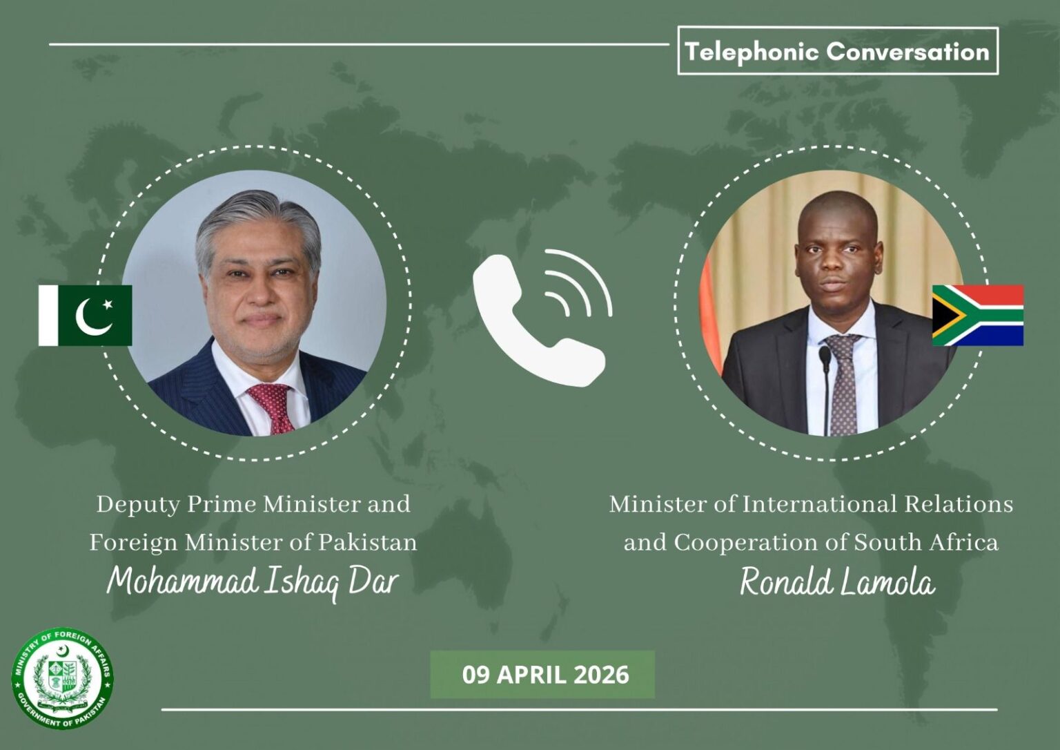 اسلام آباد (سہ پہر) نائب وزیرِ اعظم،وزیرِ خارجہ سینیٹر محمد اسحاق ڈار نے آج جنوبی افریقہ کے وزیر برائے بین الاقوامی تعلقات و تعاون، رونالڈ لامولا کے ساتھ ٹیلیفون پر گفتگو کی۔دونوں رہنماں نے مشرقِ وسطی اور وسیع تر خطے میں ہونے والی تازہ پیش رفت پر تبادلہ خیال کیا۔