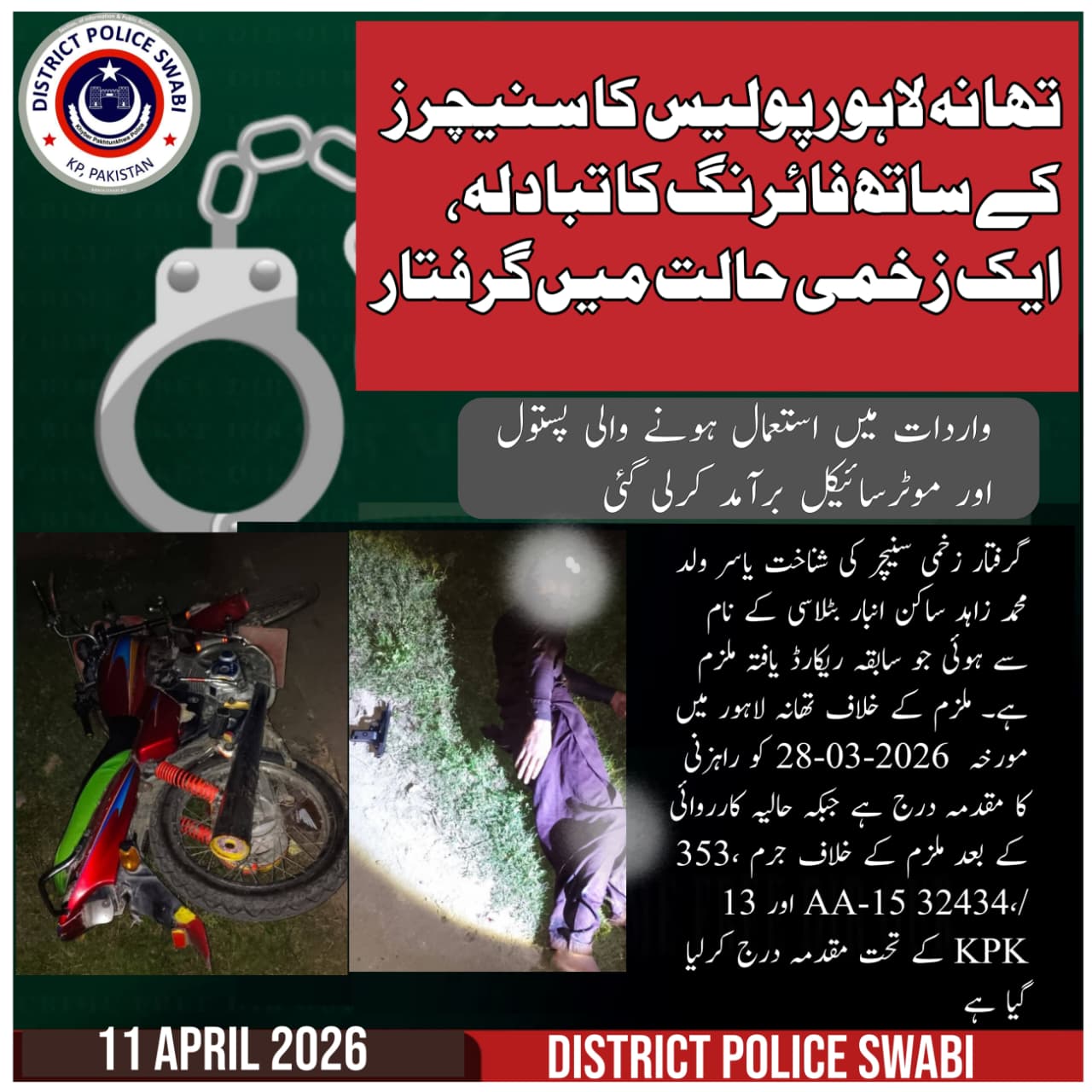 گرفتار زخمی سنیچر کی شناخت یاسر ولد محمد زاہد ساکن انبار بٹلاسی کے نام سے ہوئی جو سابقہ ریکارڈ یافتہ ملزم ہے۔ ملزم کے خلاف تھانہ لاہور میں مورخہ 28-03-2026 کو راہزنی کا مقدمہ درج ہے جبکہ حالیہ کارروائی کے بعد ملزم کے خلاف جرم 353، 324/34، 15-AA اور 13 KPK کے تحت مقدمہ درج کرلیا گیا ہے۔