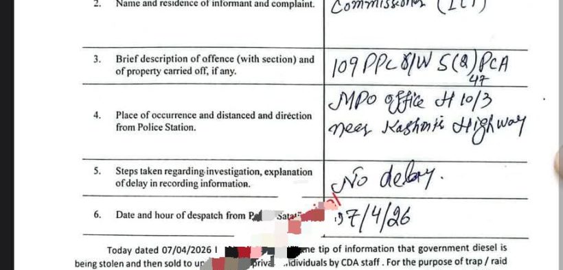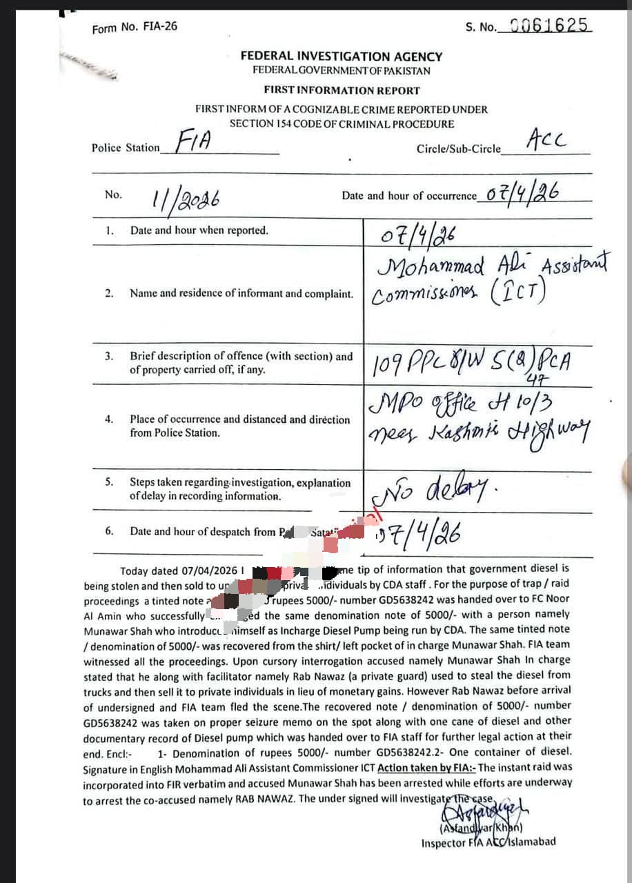 اسلام آباد (سہ پہر): سی ڈی اے کا سرکاری ڈیزل چوری اسکینڈل بے نقاب، ایف آئی اے کی کارروائی،ایک ملزم گرفتار،دوسرا عادی ملزم رب نواز گارڈ فرار اسلام آباد میں فیڈرل انویسٹیگیشن ایجنسی (ایف آئی اے) نے سی ڈی اے کے سرکاری ڈیزل کی چوری اور غیرقانونی فروخت میں ملوث گروہ کے خلاف بڑی کارروائی کرتے ہوئے ایک ملزم کو گرفتار کر لیا جبکہ اس کا ساتھی فرار ہو گیا۔تفصیلات کے مطابق ایف آئی اے نے مقدمہ نمبر 11/2026 مورخہ 07 اپریل 2026 درج کیا، جس کی اطلاع اسسٹنٹ کمشنر اسلام آباد محمد علی کی جانب سے دی گئی۔ رپورٹ کے مطابق ایف آئی اے کو خفیہ اطلاع ملی کہ سرکاری ڈیزل چوری کرکے نجی افراد کو فروخت کیا جا رہا ہے۔اطلاع ملنے پر ایف آئی اے ٹیم نے اسلام آباد کے علاقے ایم پی او آفس H-10/3، کشمیر ہائی وے کے قریب چھاپہ مار کارروائی کی۔ کارروائی کے دوران ٹریپ کے طور پر 5000 روپے کا نشاندہی شدہ نوٹ ایف سی اہلکار کے ذریعے ملزم کو دیا گیا۔ ملزم نے خود کو سی ڈی اے کے زیر انتظام ڈیزل پمپ کا انچارج ظاہر کیا۔ چھاپے کے دوران مذکورہ 5000 روپے کا نوٹ ملزم منور شاہ کی جیب سے برآمد کر لیا گیا، جبکہ ایک ڈیزل سے بھرا کنٹینر اور ریکارڈ بھی قبضے میں ل