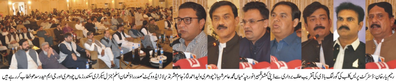 رحیم یارخان (سہ پہر) ڈسٹرکٹ پریس کلب (رجسٹرڈ) رحیم یار خان کی نو منتخب گورننگ باڈی کی باوقار تقریبِ حلف برداری، ڈپٹی کمشنر ظہیر انور جپہ اور میاں عامر شہباز نے نو منتخب عہدیداران سے حلف لیا، یادگاری شیلڈز کی تقسیم کی گئیں، شہری مسائل کے حل اور مثبت امیج اجاگر کرنے میں انتظامیہ اور صحافی برادری کا باہمی تعاون کو مزید فروغ دیا جائے گا، ڈپٹی کمشنر کا خطاب، پریس کلب کی نئی قیادت صحافتی اقدار کو مضبوط کرے گی، میاں عامر شہباز، تاجر، وکلاء اور صحافی سچ کے علمبردار ہیں، ولید نثار، مبشر لاڑ،