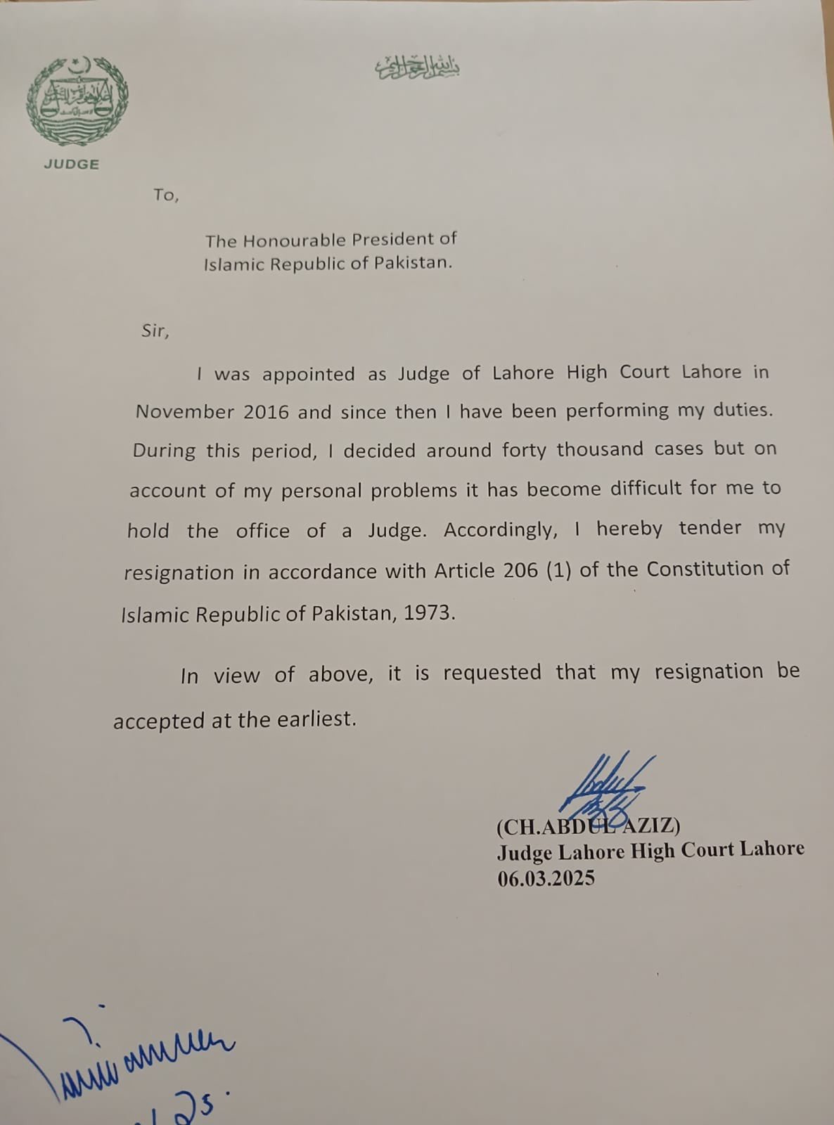 جسٹس چوہدری عبد العزیز نے صدر مملکت اسلامی جمہوریہ پاکستان کو ارسال کیے گئے اپنے استعفے میں لکھا کہ 2016 میں لاہور ہائی کورٹ کے جج کی حیثیت سے اپنی ذمہ داریاں سنبھالی تھیں۔ انہوں نے لکھا کہ بطور جج فرائض انجام دینے کے دوران تقریباً 40 ہزار کیسز کے فیصلے کیے، تاہم آئین پاکستان کے آرٹیکل 206 کے تحت اپنے عہدے سے مستعفی ہو رہا ہوں اور ذاتی وجوہات کی بنا پر مزید فرائض سرانجام نہیں دے سکتا۔