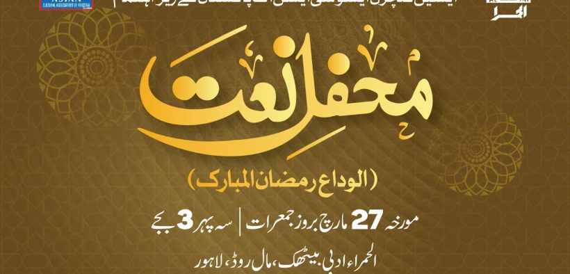 لاہور (سہ پہر) لاہور آرٹس کونسل الحمراء اور ایشین کلچرل ایسوسی ایشن آف پاکستان کے زیر اہتمام محفل نعت ( الوداع رمضان المبارک ) 27 ، مارچ بروز جمعرات 3 ، بجے سہ پہر الحمراء ادبی بیٹھک شاہراہ قائد اعظم لاہور میں منعقد کی جا رہی ہے