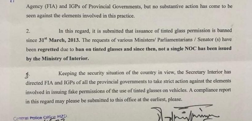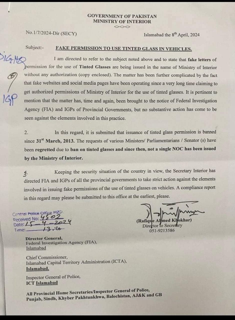 اسلام آباد (سہ پہر) یہ مراسلہ پاکستان کی وزارت داخلہ کی طرف سے جاری کیا گیا ہے کہ کسی شخص کو بھی اپنی گاڑی کے شیشے کالے کرنے کی اجازت نہیں دی گئی ۔۔ اور,پاکستان مین جو بھی فرد یا کوئی بھی ادارہ کالے شیشے استعمال کررہا ہے وہ ایک جرم کا مرتکب ہو رہا ہے