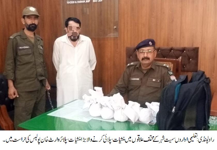 راولپنڈی (سہ پہر)(مظہر شاہ)ایس ایچ او وارث خان جواد شاہ کی سربراهی میں پولیس ٹیم بڑی کاروائی، تعلیمی اداروں سمیت شہر کے مختلف علاقوں میں منشیات سپلائی کرنے والا بڑا منشیات سپلائر گرفتار، ملزم ارشد عرف ٹلہ سے 11 کلو 200 گرام چرس برآمد ہوئی،ملزم قبل ازیں منشیات کے درجنوں مقدمات میں ریکارڈ یافتہ اور سزایافتہ ہے۔ تفصیلات کے مطابقایس ڈی پی او وارث خان سرکل ملک رفاقت کی زیرنگرانی پولیس ٹیم نے بڑی کاروائی کرتے ہوئے تعلیمی اداروں سمیت شہر کے مختلف علاقوں میں منشیات سپلائی کرنے والے بڑے منشیات سپلائر ارشد عرف ٹلہ کو گرفتار کرلیا، ملزم ارشد عرف ٹلہ سے 11 کلو 200 گرام چرس برآمد ہوئی،ملزم قبل ازیں منشیات کے درجنوں مقدمات میں ریکارڈ یافتہ اور سزایافتہ ہے،ملزم کو ٹھوس شواہد کے ساتھ چالان عدالت کیا جائے گا، سی پی او سید خالد ہمدانی کا کہنا تھا کہ منشیات کے ناسور کا خاتمہ اولین ترجیح ہے جس کے لیے تمام اقدامات کیے جارہے ہیں،نوجوان نسل کی رگوں میں منشیات کا زہر اُتارنے والوں کے خلاف بھرپور کریک ڈاؤن جاری ہیں۔