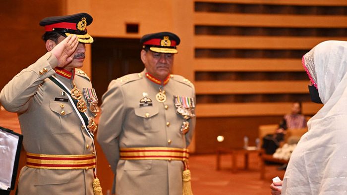 راولپنڈی (سہ پہر)(آئی پی ایس) جنرل ہیڈکوارٹرز (جی ایچ کیو) راولپنڈی میں ایک پروقار اعزازی تقریب کا انعقاد کیا گیا، جہاں پاک فوج کے سپہ سالار جنرل سید عاصم منیر، نشانِ امتیاز (ملٹری) نے ملک و قوم کے لیے نمایاں خدمات اور جرات مندانہ کارکردگی کا مظاہرہ کرنے والے افسران اور جوانوں کو عسکری اعزازات سے نوازا۔