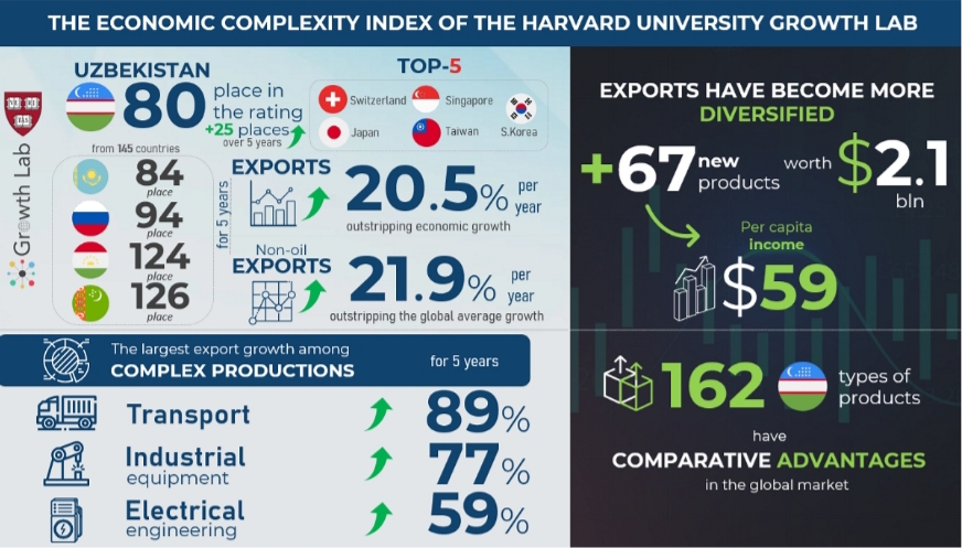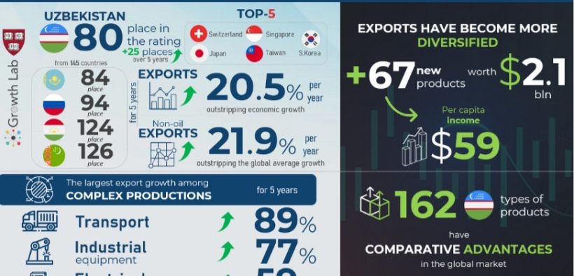 TASHKENT, Wednesday, April 23, 2025 (Sapeher Times): Uzbekistan has recorded remarkable economic progress, rising 25 positions over the past five years to rank 80th among 145 countries in the latest Economic Complexity Index (ECI) published by the Growth Lab at Harvard University.