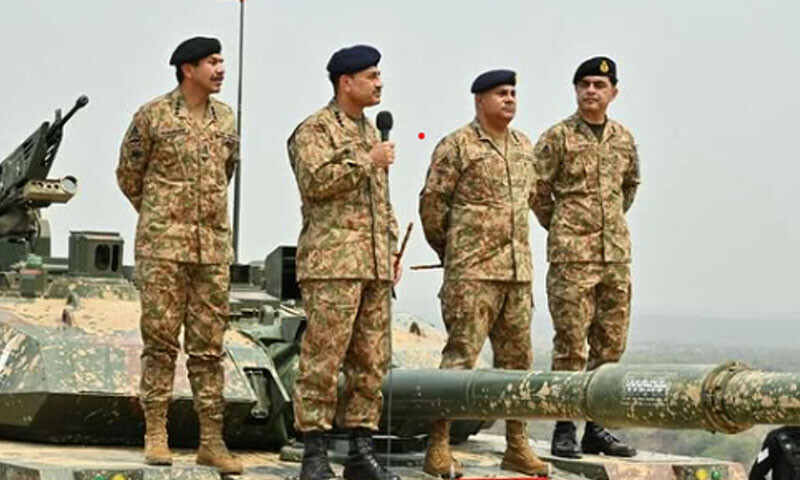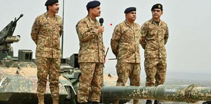 اسلام آباد (سہ پہر) ,پاکستانی عسکری اور سیاسی قیادت نے ایک بار پھر بھارتی مہم جوئی پر منہ توڑ جواب دینے کا دبنگ اعلان کیا ہےخاص طور پر سامنے سے قیادت کرتے ہوئے پاکستان کے سپہ سالار جنرل سید عاصم منیر کا بھارت کی کسی بھی مہم جوئی کا منہ توڑ جواب دینے کا دبنگ اعلان کڑوروں پاکستانیوں کے دلوں کی آواز ہے پاک فوج کے شعبہ تعلقات عامہ آئی ایس پی آر سے جاری بیان کے مطابق آرمی چیف جنرل عاصم منیر نے ٹلہ فیلڈ فائرنگ رینج کا دورہ کیا, جہاں “ایکسسرسائز ہیمر اسٹرائیک”میں جنگی تیاریوں، جدید ٹیکنالوجی کا عملی مظاہرہ کیا گیا۔