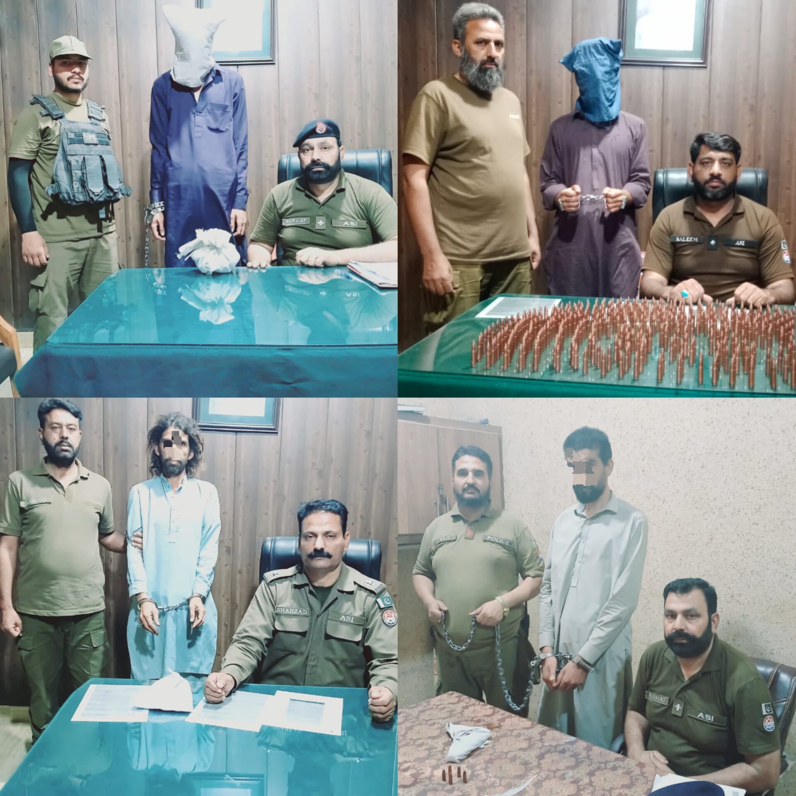 علاقے میں دوران ناکہ بندی 04 ملزمان گرفتار 500 روند کلاشنکوف ۔1400گرام چرس و اسلحہ 30 بور پسٹل بمہ روند برآمد تفصیلات کے مطابق تھانہ صدر واہ کینٹ کے علاقے میں مختلف مقامات پر ناکہ بندی کے دوران محمد سلیم اے ایس آئی ہمراہ ٹیم نے براہمہ انٹرچینج کے قریب ملزم شیان ولد احسان اللہ سے 500 روند کلاشنکوف برآمد کر لئے جبکہ اے ایس آئی فرحت جہانگیر نے ہمرہ ٹیم مسکین آباد چوک میں موٹرسائیکل سوار شخص سے حمائت علی سے پسٹل 30 بور بمہ روند اور منشیات فروش کو بھی گرفتار کر کے 1400 گرام چرس برآمد کر لی مزید کاروائی میں محمد شہزاد اے ایس آئی نے ہمراہ ٹیم ملزم ایاز خان سے پسٹل 30 بور لوڈ شدہ برآمد کر لیا ۔ ایس پی پوٹھوہار نے پولیس ٹیم کو شاباش دیتے ہوئے کہا کہ جرائم پیشہ افراد کیخلاف بلا تفریق کاروائیاں جاری رہیں گی ۔