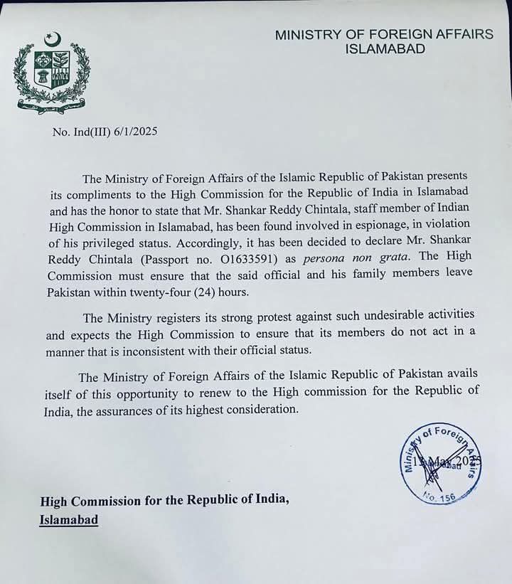 اہلکار کو 24 گھنٹے میں پاکستان چھوڑنے کی ہدایت کی گئی ہے