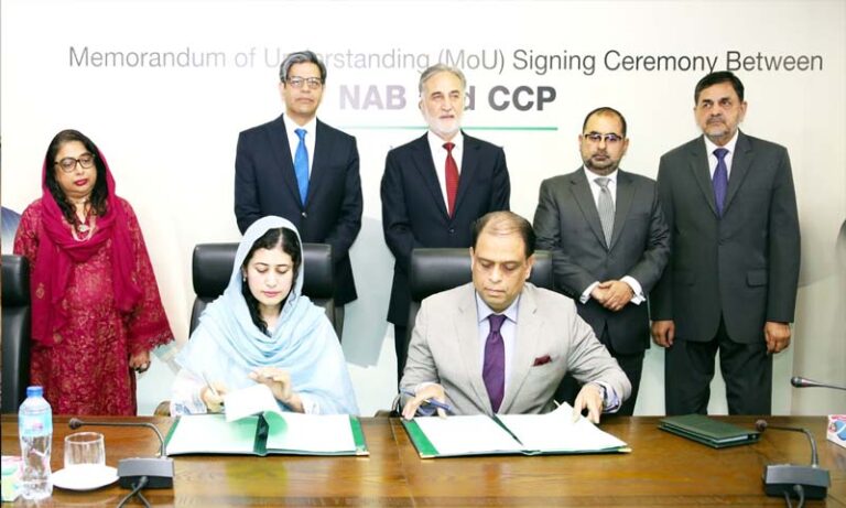 دونوں اداروں کے درمیان تکنیکی تعاون، مشترکہ حکمت عملی پر بھی کام کیا جائے گا۔ معاہدے کے تحت بولیوں کے ڈیٹا تک رسائی، خطرات کی نشاندہی اور قوانین کی پاسداری یقینی بنائی جائے گی۔چیئرمین نیب نے اس موقع پر کہا کہ سرکاری وسائل کے استعمال میں قانون کے تحت مقررہ قواعدو ضوابط پر سختی سے عمل در آمد کے ساتھ ساتھ بولیوں میں کسی قسم کے غیر قانونی ہتھکنڈوں کے مرتکب عناصر کے خلاف قانونی کاروائی اور شفافیت یقینی بنانے کے لئے قومی احتساب بیورو اپنا بھر پور کردار ادا کرے گا۔ چیئرمین نیب لیفٹیننٹ جنرل ریٹائرڈ نذیر احمد نے کہا کہ کرپشن اور ملی بھگت سے نمٹنا سی سی پی اور نیب کی مشترکہ ذمہ داری ہے، پبلک پروکیورمنٹ میں کرپشن سے قومی خزانے کو پہنچنے والے نقصان سے بچانے کے لئے نیب سی سی پی کی ڈیٹا اینالائسز مہارتوں سے استفادہ کرے گا ۔