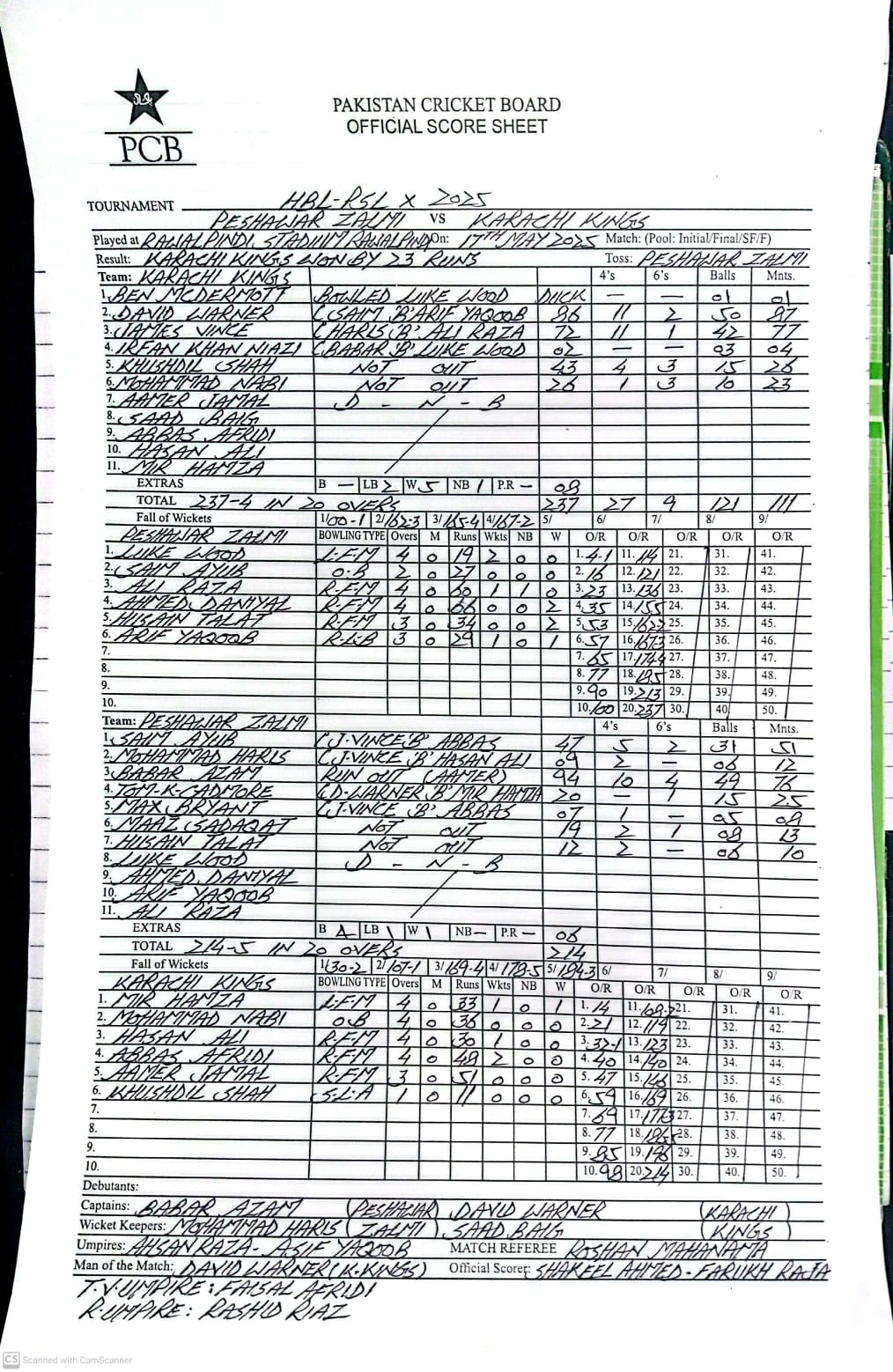 راولپنڈی (سہ پہر) پی ایس ایل 10: کراچی کنگز کی پشاور زلمی کو 23 رنز سے شکست