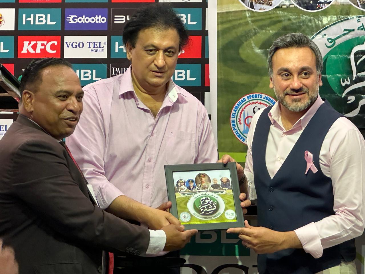 Speaking on the occasion, founder president South Asian Sports Journalists Association Asghar Ali Mubarak paid tribute to the Pakistan Army. He said that the “Operation Banyan Marsus” of the war of truth has proved that the Pakistan Army is the best army in the world. He said that the nexus of Hindus and Jews was defeated with the power of unity. The revival of cricket in Pakistan has proven that Pakistan is a country of cricket lovers. Asghar Ali Mubarak praised the unparalleled strategic intelligence of the Army Chief. He said that honoring those who instill fear in the hearts of enemies is the hallmark of dynamic and resilient nations. In this regard, journalists at a ceremony held at Pindi Cricket Stadium Shakeel Ahmed Awan, Zahid Khan, Farhat Turbi, Saleh Mughal, Tahir Naseer Malik, Asim Riaz, Farhan Hussain, Afzal Javed, Faheem Anwar, Dr. Zahid Awan, Ambrain Ali, Rozeena Ali, Kiran Khan, Maria Rajput, Shakir Abbasi, Arsalan Shirazi, Sohail Raja, Nasir Raja, Hafiz Obaid-ur-Rehman, Ikram Joya, Luqman Shah, Muhammad Ali Jah, Arfa Feroz Zaki, Muhammad Zarif, Ahmed Hammad Siddiqui, Nasir Naqvi, Zulfiqar Baig, Jabbar Faisal, Raja Imran, Ali Dawood, Aqeel Anjum, K Asif, Zeeshan Qayyum, Shahryar Khan, Rana Faheem, Asim Jilani, Owais Abbasi, Abi Bakar, Waqar Ahmed, Mujatba Haider, Shakir Abbasi, M. Owais, Zain Malik, Zahid Farooq Malik, Mudassar Chaudhry, Khalid Chaudhry, Asghar Ali Mubarak, Abdul Mohi Shah. Imran Satti, Hafeez Sultan EMT 1122,
