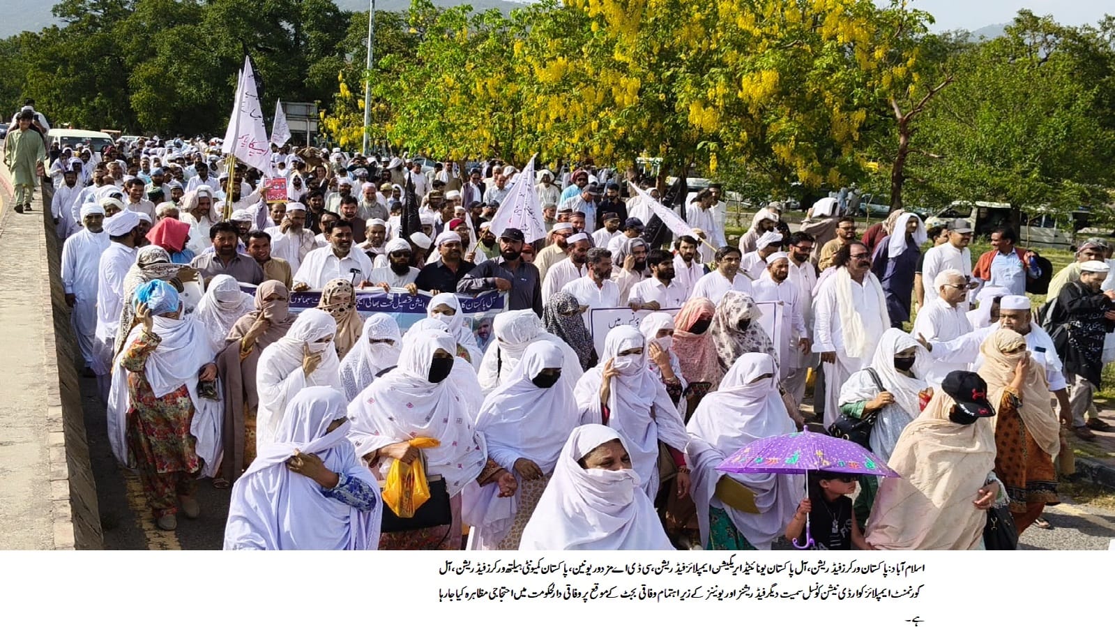 پاکستان ورکرز فیڈریشن، آل پاکستان یونائٹیڈ ایریگیشن ایمپلائز فیڈریشن، سی ڈی اے مزدور یونین، پاکستان کمیونٹی ہیلتھ ورکرز فیڈریشن، آل گورنمنٹ ایمپلائز کوارڈی نیشن کونسل سمیت دیگر فیڈریشنز اور یونینز کے زیر اہتمام وفاقی بجٹ کے موقع پر وفاقی دارلحکومت میں بھرپور احتجاجی مظاہرہ کیا گیا۔ جس میں پاکستان بھر سے ہزاروں ملازمین نے شرکت کی۔ مظاہرین سے خطاب کرتے ہوئے مزدور قائدین چوہدری محمد یسین، شوکت علی انجم، محمد اعظم فقیر، جاوید بلوچ، فضل حکیم، حاجی انور کمال، رفاسیت قمر، راجہ ہارون، عابد شیوہ، چوہدری اسدالرحمن عاصی و دیگر نے کہا کہ موجودہ دور میں مہنگائی میں روز بروز اضافہ ہو رہا ہے، پاکستان کے محنت کش اس وقت بڑھتی ہوئی مہنگائی، کم اجرت اور غیر یقینی مستقبل کے شدید دباؤ کا سامنا کر رہے ہیں، لیبر قوانین پر عمل درآمد نہ ہونے کی وجہ ملازمین کو قانونی تحفظ حاصل نہیں ہے۔ موجودہ حالات میں منافع بخش اداروں کی نجکاری سے بیروزگاری میں اضافہ ہورہا ہے اور اداروں میں مستقل بھرتی کے بجائے ڈیلی ویجز اور ٹھیکیداری نظام کے تحت ملازمین کا استحصال کیا جارہے ہے۔ مزدورتنظیموں سے مشاورت کے بغیر پنشن اصلاحات کی جارہی ہیں جس سے ملازمین سخت بے چینی کا شکار ہیں۔ موجودہ بجٹ میں ملازمین کی تنخواہوں میں اضافے کے حوالے سے کو ئی جامع حکمت عملی نہیں ہے، وفاقی وزارء ممبران قومی اسمبلی کی تنخواہوں میں بے پناہ اضافہ کیا گیا ہے۔ اس موقع پر انھوں نے صدر پاکستان، وزیر اعظم پاکستان، وفاقی وزیر خزانہ و دیگر ذمہ داران سے مطالبہ کیا کہ ملازمین کی تنخواہوں اور پنشن میں مہنگائی کے تناسب سے 100 فیصد اضافہ کیا جائے، کم ازکم اجرت60 ہزار مقرر کی جائے، اداروں کی نجکاری بند کی جائے، کنٹریکٹ اور ایڈ ہاک ازم سے اداروں کو پاک کیا جائے، پنشن اصلاحات کوواپس کیا جائے، وزیر اعظم پیکج کے تحت بھرتی ہونے ملازمین کے بچوں کا کوٹہ بحا ل کیاجائے، تا کہ ملازمین میں بڑھتی ہوئی بے چینی کا خاتمہ ہو سکے۔ اگر سرکاری ملازمین کے مطالبات کو فوری حل نہ کیا گیا تو ملک گیر احتجاج کیا جائے گا