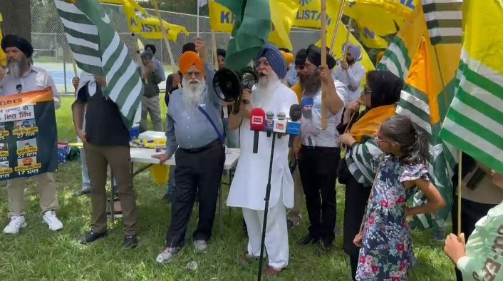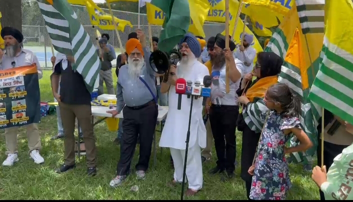 مظاہرین نے ہاتھوں میں خالصتان، آزاد کشمیر ، پاکستان اور امریکا کے پرچم اٹھا رکھے تھے۔