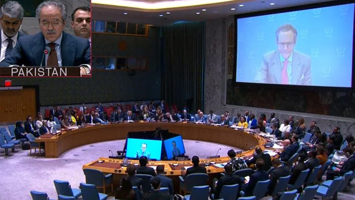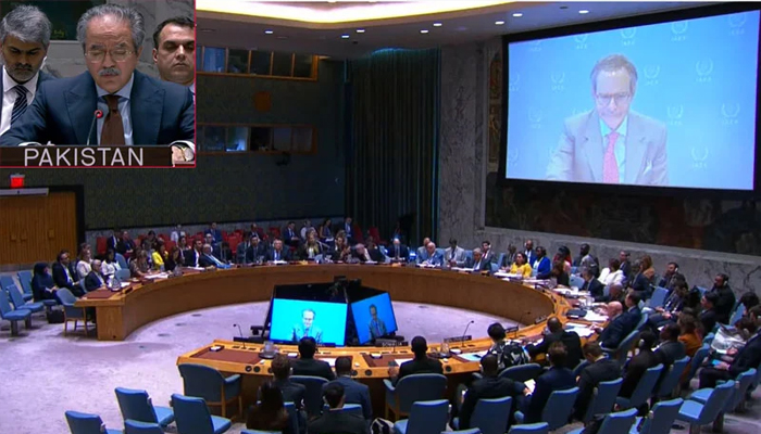 پاکستان کے مستقل مندوب عاصم افتخار نے اقوام متحدہ کی سلامتی کونسل کے اجلاس میں خطاب کرتے ہوئے کہاہے کہ اسرائیل نے اس وقت حملہ کیا جب ایران کے ایٹمی مسئلے کا پرامن حل تلاش کیا جارہا تھا، ہم امید کرتے ہیں کہ سفارتی عمل اور مذاکرات دوبارہ شروع ہونگے، اسرائیلی حملوں پر ہم اپنے برادر ملک ایران سے یکجہتی کا اظہار کرتے ہیں۔عاصم افتخار نے کہا کہ عالمی ایٹمی توانائی ایجنسی اپنی ذمہ داریاں پوری کرے، اسرائیلی جارحیت کو روکنا سلامتی کونسل کی بنیادی ذمہ داری ہے، سلامتی کونسل ایران پر ہونے والے 13 جون کے حملوں کی مذمت کرے، آئی اے ای اے کی زیر نگرانی ایٹمی پلانٹس پر حملے عالمی قوانین کی خلاف ورزی ہے، اس حوالے سے سلامتی کونسل اپنی ہی قرار دادوں پر عمل درآمد کروائے۔انہوں نے کہا کہ سیکرٹری جنرل کی جانب سے جنگ روکنے پر زور دینا قابل ستائش ہے، گزشتہ جمعہ کو سلامتی کونسل کا ہنگامی اجلاس ہوا تھا، اسرائیلی حملے یو این چارٹر اور عالمی قوانین کے خلاف ہیں، پاکستان بلا جواز غیر قانونی اسرائیلی جارحیت کی مذمت کرتا ہے۔