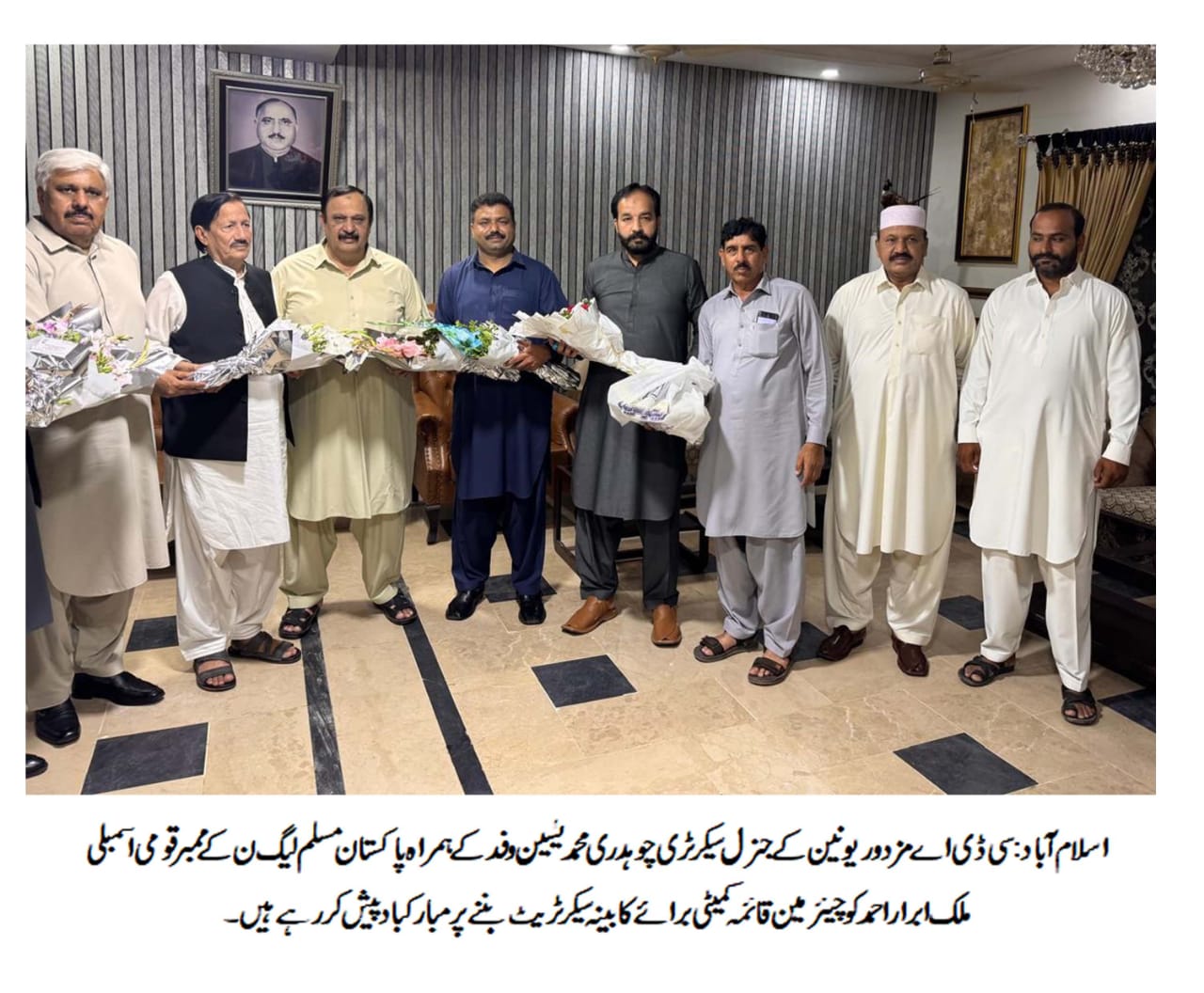 سی ڈی اے مزدور یونین کے جنرل سیکرٹری چوہدری محمد یٰسین، پاکستان ورکرز فیڈریشن کے جنرل سیکرٹری اسد محمود، چوہدری زاہد احمد، محمد شفیق عباسی و دیگر نے پاکستان مسلم لیگ (ن) کے رکنِ قومی اسمبلی ملک ابرار احمد کی رہائش گاہ کا دورہ کیا اور انہیں چیئرمین قائمہ کمیٹی برائے کابینہ سیکرٹریٹ بننے پر مبارکباد پیش کی .تقریب میں مسلم لیگ (ن) کے رکنِ صوبائی اسمبلی ملک افتخار احمد، ملک وقار احمد، طارق قدوس اور دیگر معززینِ علاقہ بھی موجود تھے۔اس موقع پر چوہدری محمد یٰسین نے کہا کہ ملک ابرار احمد کی پارٹی کے لیے خدمات قابلِ تحسین ہیں اور چیئرمین قائمہ کمیٹی بننا ان کے لیے ایک اعزاز ہے۔ انہوں نے اُمید ظاہر کی کہ ملک ابرار احمد مزدوروں کے حقوق کے لیے اپنی جمہوری اور اخلاقی جدوجہد جاری رکھیں گے۔ملک ابرار احمد نے سی ڈی اے مزدور یونین کے قائدین کا شکریہ ادا کرتے ہوئے کہا کہ وہ سی ڈی اے ملازمین اور ملک بھر کے مزدوروں کے حقوق کے تحفظ کے لیے ہر فورم پر آواز بلند کرتے رہیں گے، اور ادارے کی ترقی، مزدوروں کی خوشحالی اور شہریوں کی فلاح و بہبود کے لیے اقدامات جاری رکھیں گے۔