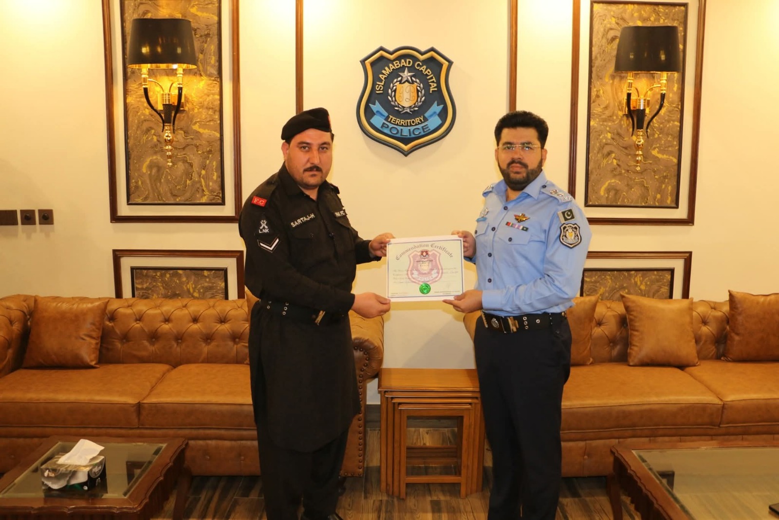 تفصیلات کے مطابق ایس ایس پی سکیورٹی محمد سرفراز ورک نے بہترین کارکردگی اور تفویض کردہ ذمہ داریوں کو احسن طریقے سے سرانجام دینے پر ایف سی کے افسران سرتاج حسین اور واجد علی کو اپنے دفتر مدعو کیااوران سے ملاقات کی،ایس ایس پی محمد سرفراز ورک نے افسران کی فرائض میں اعلیٰ کارکردگی کو سراہتے ہوئے انہیں تعریفی اسناد اور انعام سے نوازا،اس موقع پر انہوں نے کہا کہ تمام افسران اسی جذبے کے ساتھ شہریوں کے جان و مال کی حفاظت کو یقینی بنانے کے لئے اپنے فرائض سر انجام دیں،ہمارا اولین فرض اور ہمارے اس حلف کا ہم سے تقاضا بھی یہی ہے جو ہم نے یہ وردی زیب تن کرتے ہوئے اٹھایا تھا ،انہیں نے تمام افسران کو مستعدی ،فرض شناسی اور ایمانداری کے ساتھ اپنے فرائض سرانجام دینے کی ہدایت کی،انہوں نے مزید کہا کہ پولیس افسران کی اچھی کارکردگی کو سراہا جائے گا جبکہ ناقص اور غیر تسلی بخش کارکردگی کا مظاہرہ کرنیوالے افسران کے خلاف محکمانہ کارروائیاں عمل میں لائی جائے گی، انہوں نے فرنٹیئر کانسٹیبلری کے افسران سے مخاطب ہو کر کہا کہ آپ لوگ اسلام آباد پولیس کے افسران کے شانہ بشانہ اپنی ڈیوٹیاں سر انجام دے رہے ہیں جوکہ قابل تعریف ہے، آپ کو کسی بھی قسم کا مسئلہ یا پریشانی درپیش ہوتو میرے دفتر کے دروازے آپ کے لئے ہمیشہ کھلے ہیں