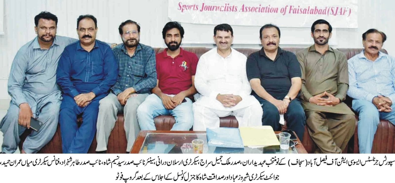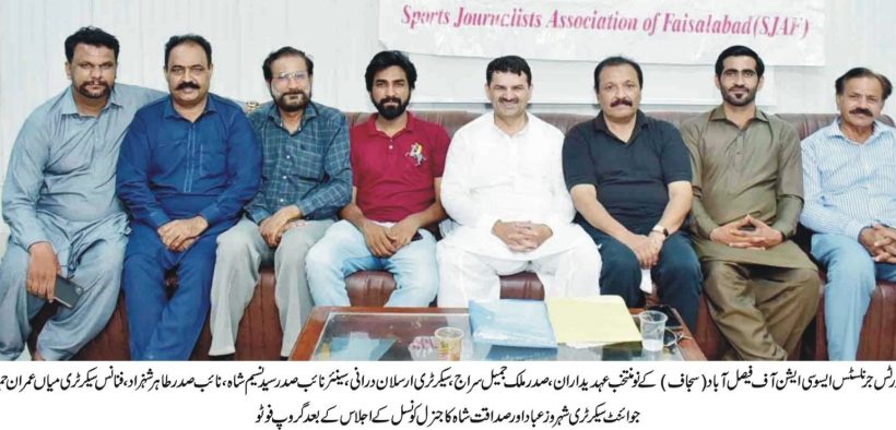 فیصل آباد (سہ پہر) سپورٹس جرنلسٹس ایسوسی ایشن فیصل آباد(سجاف) اجلاس’ملک جمیل سراج صدر جبکہ ارسلان درانی سیکرٹری منتخب
