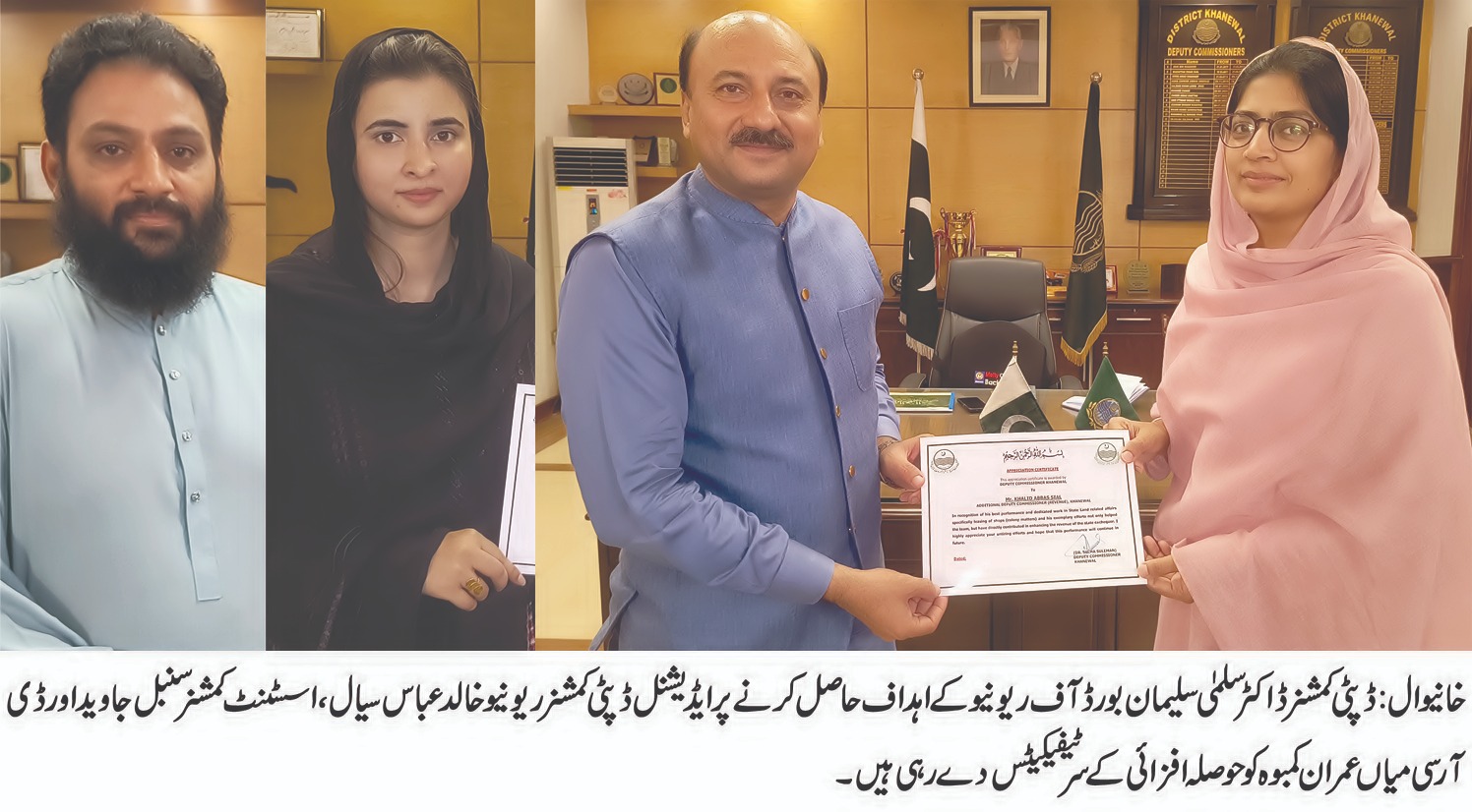 اسلام آباد (سہ پہر) حکومت پنجاب کے بورڈ آف ریونیو کیطرف سے سرکاری اراضی،دکانوں کو لیز پر دینے اور قبضہ مافیا سے سرکاری اراضی اور دکانیں واگزار کرانے پر ایڈیشنل ڈپٹی کمشنر ریونیو خانیوال خالد عباس سیال اور انکی ٹیم کی شاندار کارکردگی کو سراہا گیا ہے،اس حوالے سے بورڈ آف ریونیو کی ہدایت پر ڈپٹی کمشنر خانیوال ڈاکٹر سلمیٰ سلیمان نے ایڈیشنل ڈپٹی کمشنر ریونیو خالد عباس سیال،اسسٹنٹ کمشنر سنبل جاوید اور ڈی آر سی میاں عمران کمبوہ کو بہترین پرفارمینس پر حکومت پنجاب کیطرف سے(Appreciation Letter)حوصلہ افزائی کے سرٹیفکیٹس دیئے ہیں۔ایڈیشنل ڈپٹی کمشنر ریونیو خالد عباس سیال کا کہنا ہے کہ میں نے اور میری ٹیم نے حکومت پنجاب کے احکامات پر خلوص دل سے عمل کرکے فرائض کی ادائیگی کو یقینی بنایا ہے،انہوں نے کہا کہ بورڈ آف ریونیو کی ہدایت پر ضلع خانیوال میں مختلف چکوک کی307ایکڑ اراضی مالیت 1745ملین زرعی اراضی اور 920ملین کی سرکاری دکانات واگزار کرائی گئی ہیں۔انہوں نے بتایا کہ مستقبل قریب میں بھی حکومتی احکامات کی اچھے انداز میں عملداری کو احسن انداز میں یقینی بنایا جائے گا۔